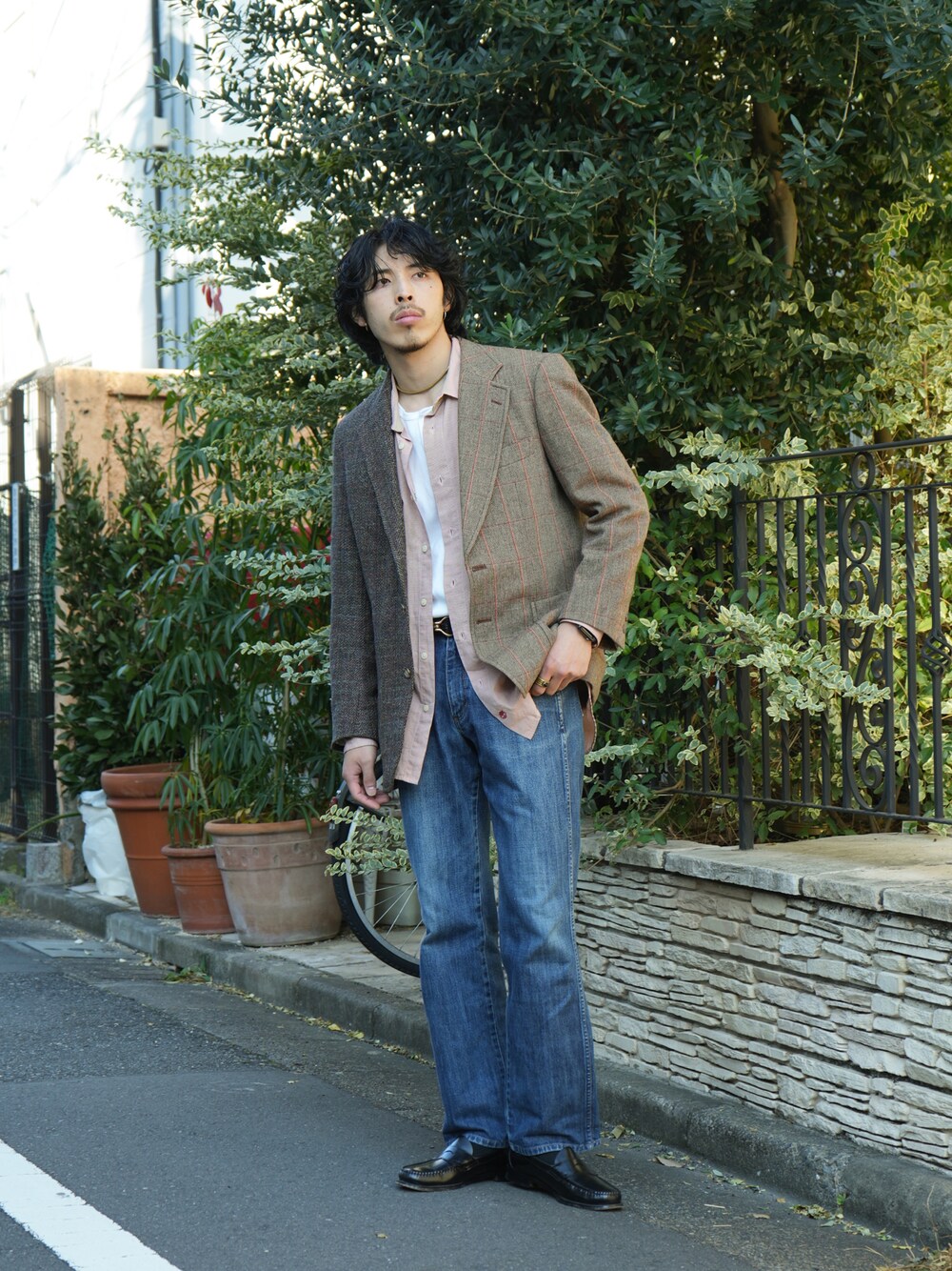 ストレートデニムにリメイクしたテーラードジャケットを合わせています。 シャツやローファーを履いてトラッドっぽさも取り入れています☺︎