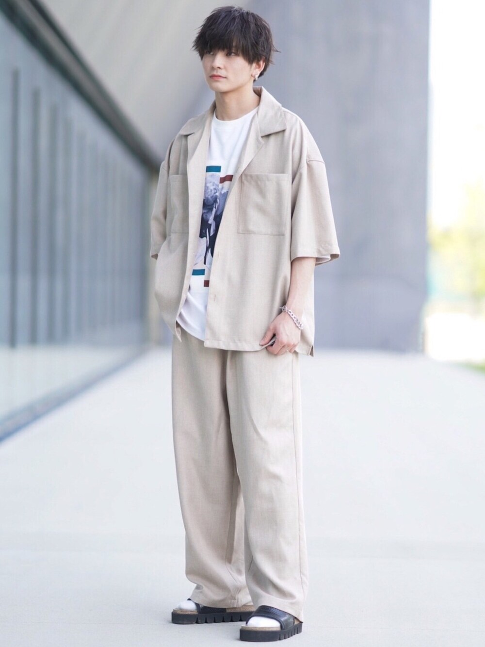 ユウトのセットアップ「【ZIP FIVE】【セットアップ 2点セット】リネンライクシャンブレー ルーズシルエット オープンカラーシャツ&ワイドパンツ」を使ったコーディネート