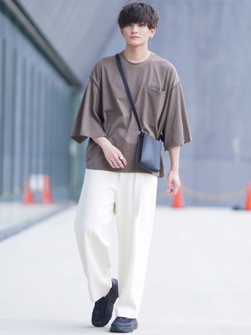 昨日発売のYUEATEの ビッグTを使ったコーデ🌀 チャコール大人な雰囲気😎 ホワイトパンツとも相性抜群🔥 小物を黒にしてまとめ役。