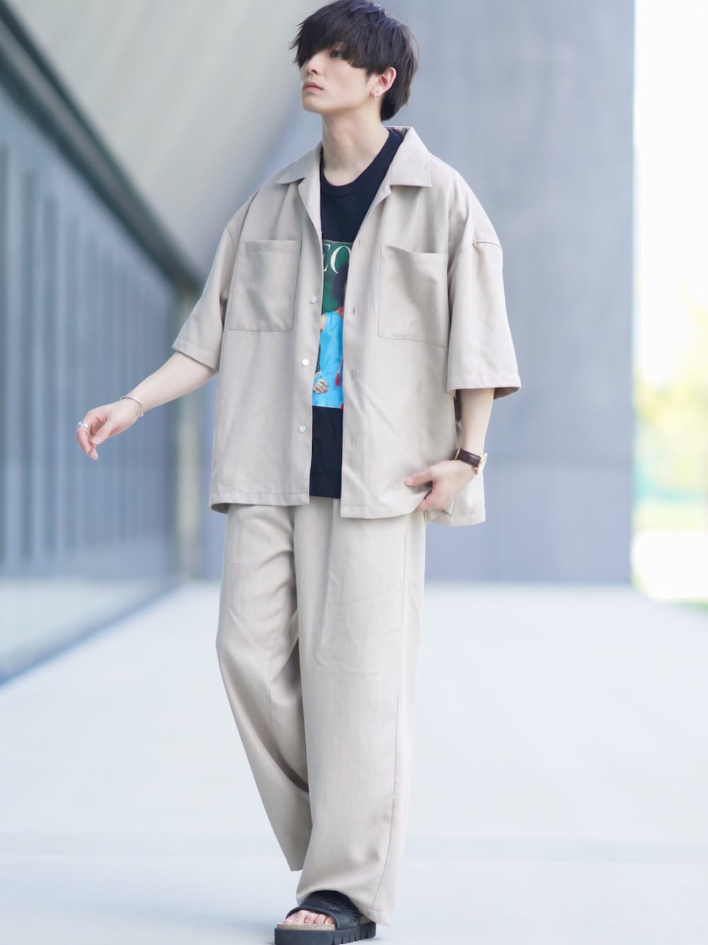 ユウトのセットアップ「【ZIP FIVE】【セットアップ 2点セット】リネンライクシャンブレー ルーズシルエット オープンカラーシャツ&ワイドパンツ」を使ったコーディネート