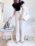 モノトーンコーデ ココちゃんと一緒にฅ゛ しまむら クリオネハイショクフリル 中黒 M 税込 1,089 2色カラーの可愛いトップス 肩にかけて落ちる大きめフリルがめっちゃ可愛い𓂃⑅⃛ パンツ合わせでスタイリングしてみた⸜ ෆ ⸝