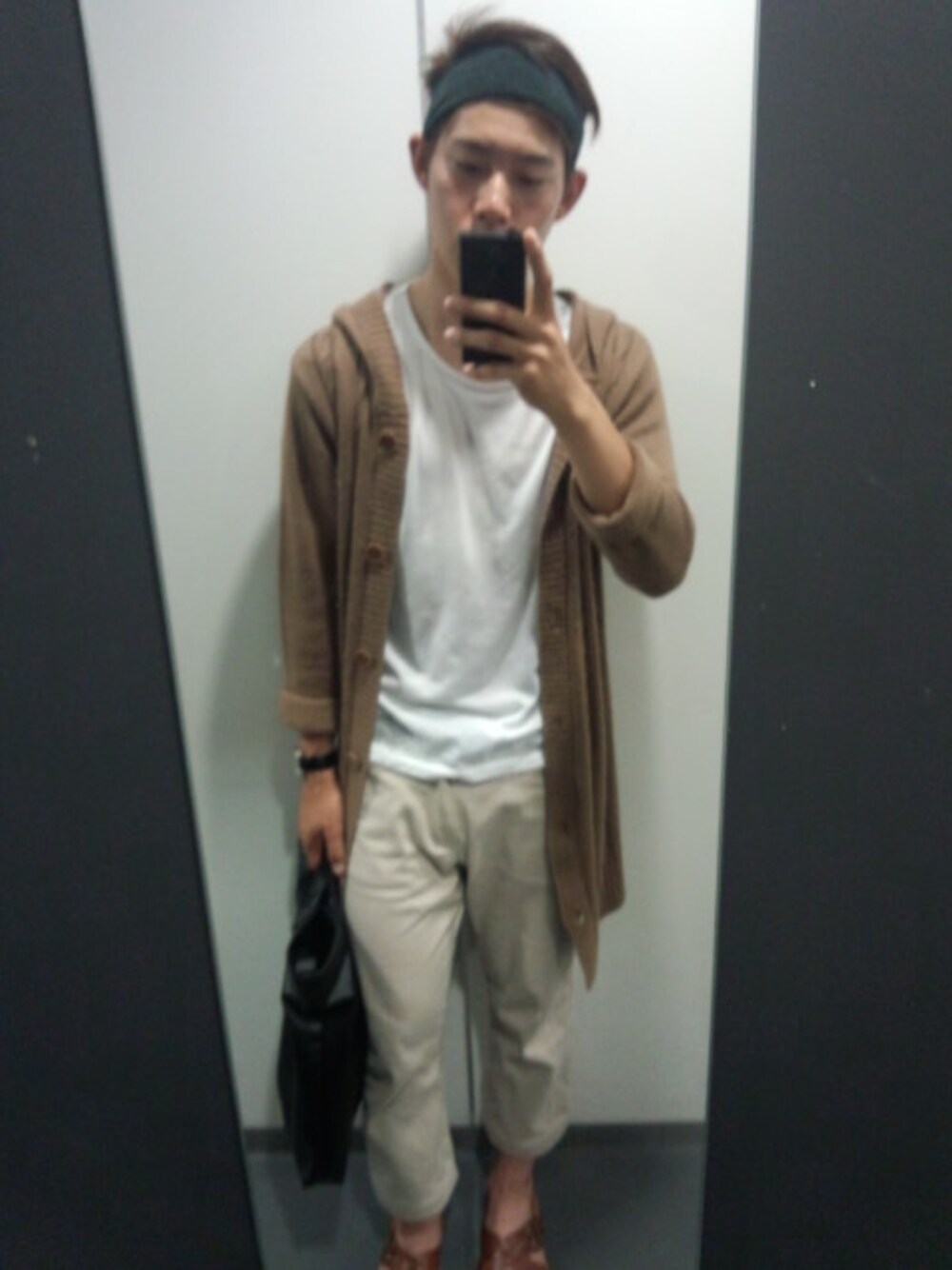 ヘアバンド:無印 ロングコート(薄手):古着 シャツ:comme ca ism スウェットパンツ:spell bound サンダル:whoop de do