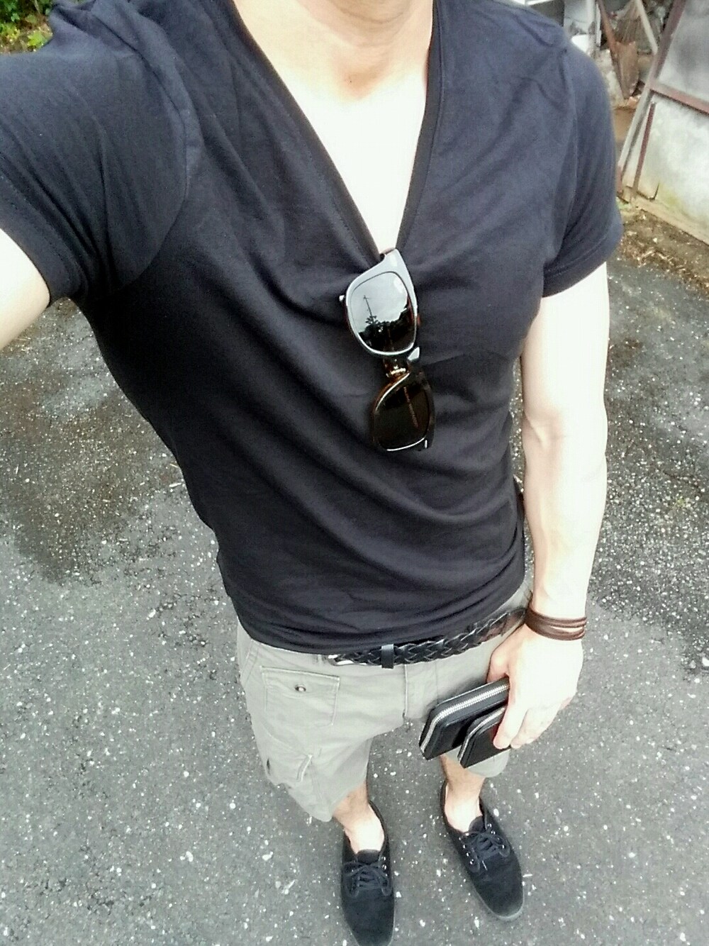 こんばんは♪ 今日はラフにシンプルに(^^)/ 黒をメインに腕のレザーにサングラスはブラウンで合わせてまーす(^o^) それにしても最近暑いですよね(°▽°) でもでも普段はまだまだクールビズはしていないyuuなのでした(  ̄▽ ̄)笑 でわ(^o^)