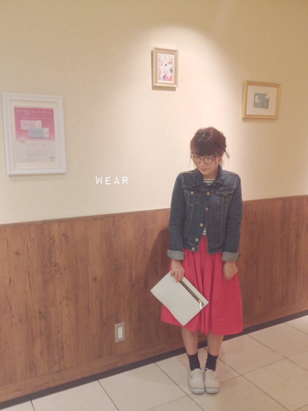 こんにちは☺︎☺︎☺︎ 去年買った 赤スカート 今年の方が 履く回数増えそう♡♡♡ デニムジャケット...H&M ボーダーT...UNIQLO スカート...SanJuan 靴...VANS めがね...アダムエロペ バック...kate spade saturday