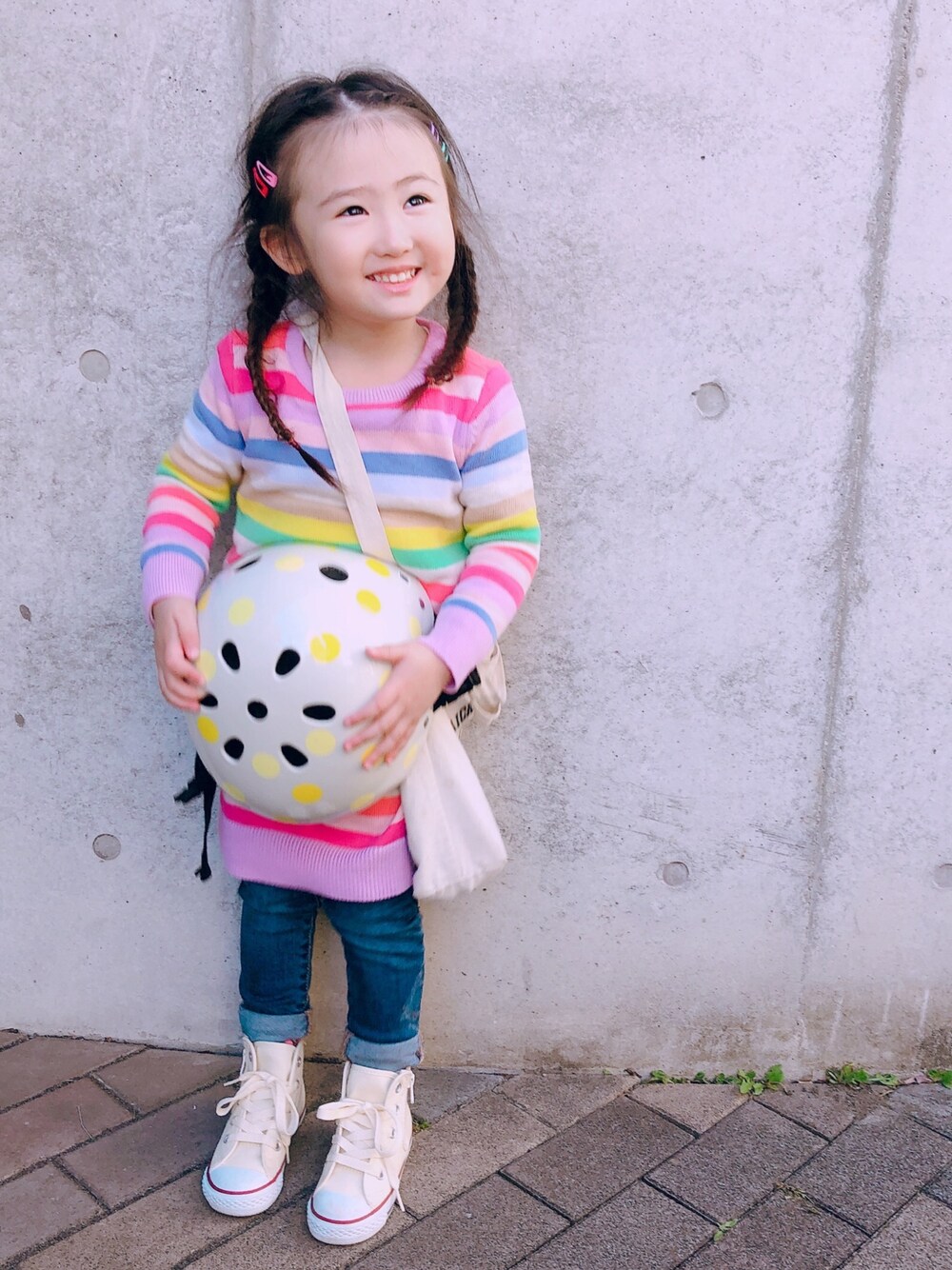 gapのマルチボーダー 派手だけど可愛いなー♡♡♡ マルチボーダーに合わせて 前髪もカラフルパッチンで 留めてみた♡
