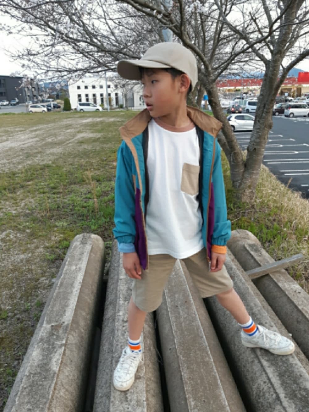 ご覧いただきありがとうございます✨ 夕方、肌寒くてナイロンジャケット羽織りました。 下のロンTがカラフルでかわいかったんですが、 「ママ寒いって…」 我慢できなかったようです…💧 ソックスとロンTの色を合わせたのに😢