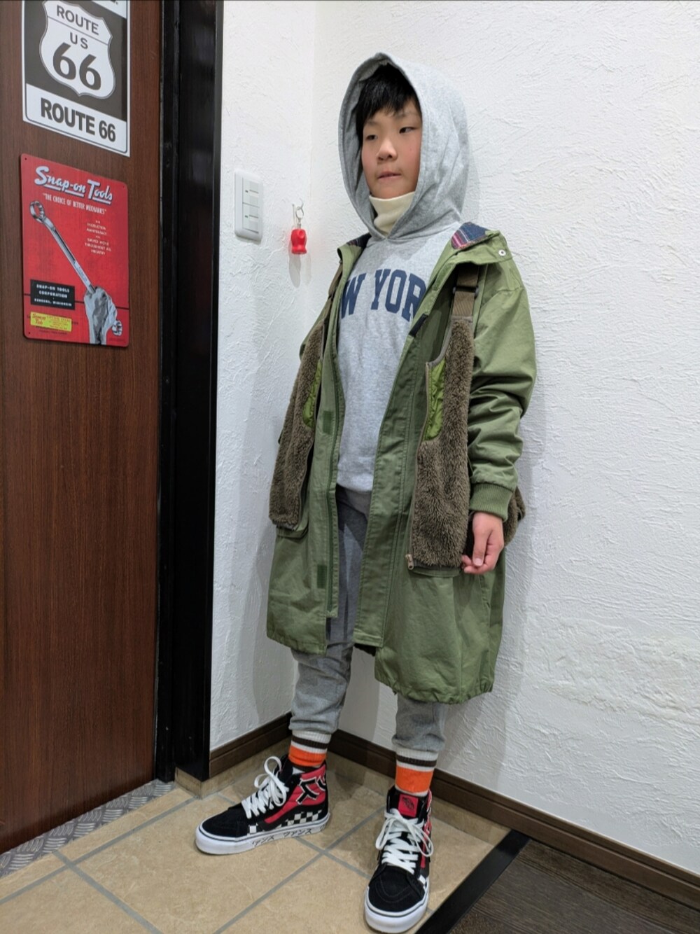 ご覧いただきありがとうございます✨ グレーのスウェット同士をセットアップ風に🩶 モッズコートにボアベストをオンしました🥰