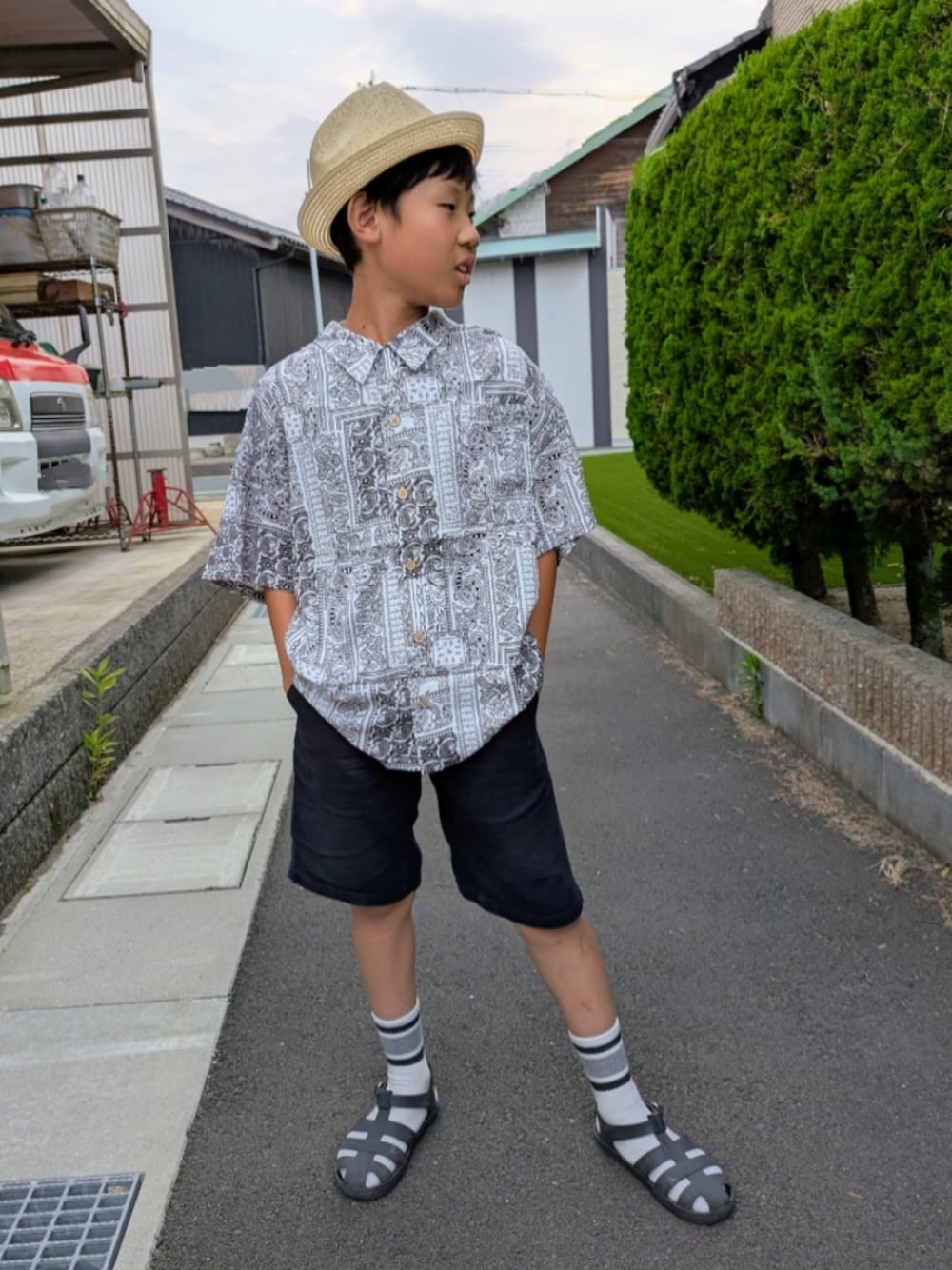 ご覧いただきありがとうございます✨ 夏のモノトーンコーデです🥰 他のカラーを入れずにシンプルかっこよく🖤🩶🤍 ペーズリー柄のアロハシャツが涼しそうでいいです👍