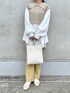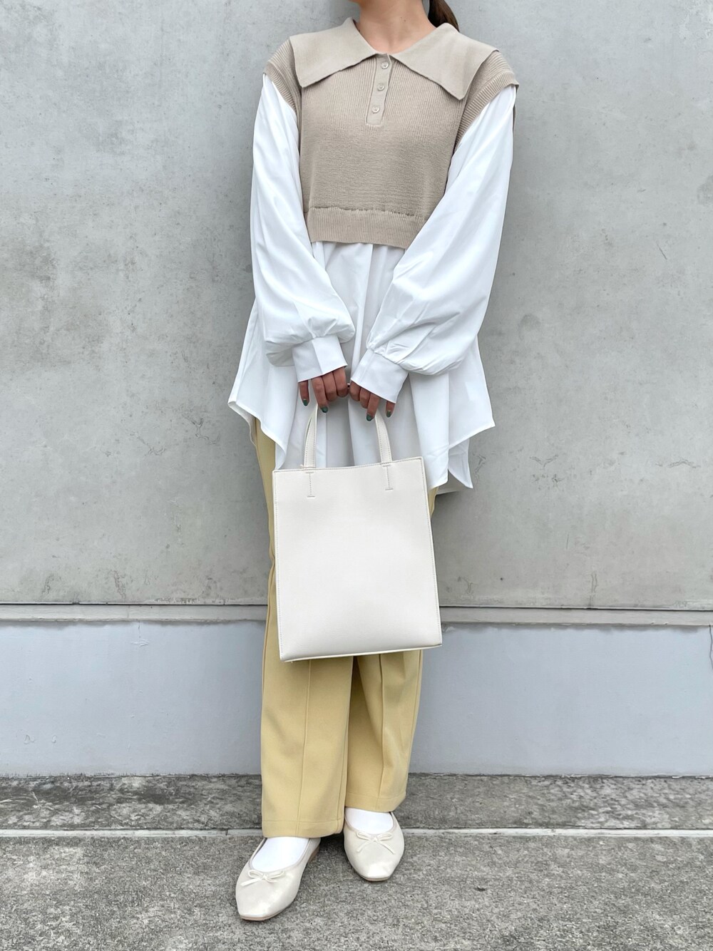 〈tops〉 一枚で主役になるレイヤード風のチュニックシャツ。画像ではカラーパンツを合わせていますが、春らしくデニム合わせもおすすめです◎ 〈pants〉 S・M・Lサイズ展開で、画像ではSサイズを着用しています。ウエストゴムで楽に履けて、ハイウエストとセンターラインのデザインがスタイルアップして見せてくれます。