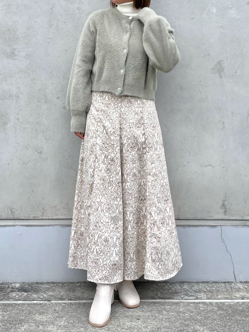 〈tops〉 肌触りのよいフェザー素材のカーディガンは保温性が高く、活躍すること間違いなしです。毛玉ができにくい素材なので、お手入れもラクで着られるのもポイント◎ 〈skirt〉 スタイルアップ効果のあるAラインシルエットと、バックレースデザインが女性らしい印象にしてくれます。ダマスク柄なので、甘めが苦手な方にもおすすめです*
