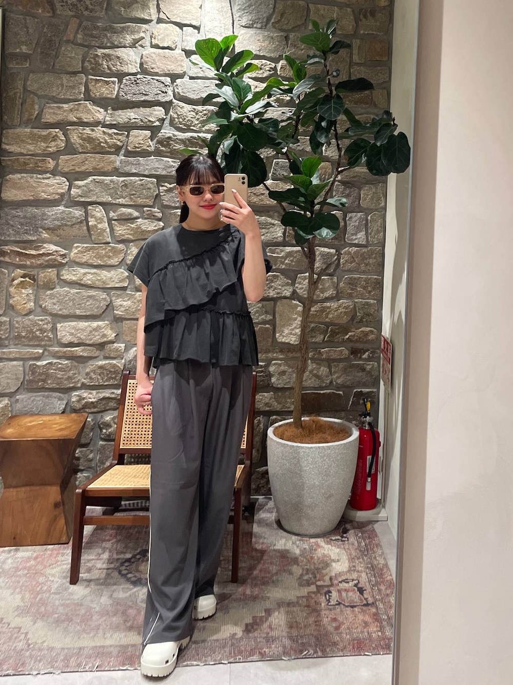 フリルのついたトップスは丈が短いのでインしなくてもすっきりきれます^ ^