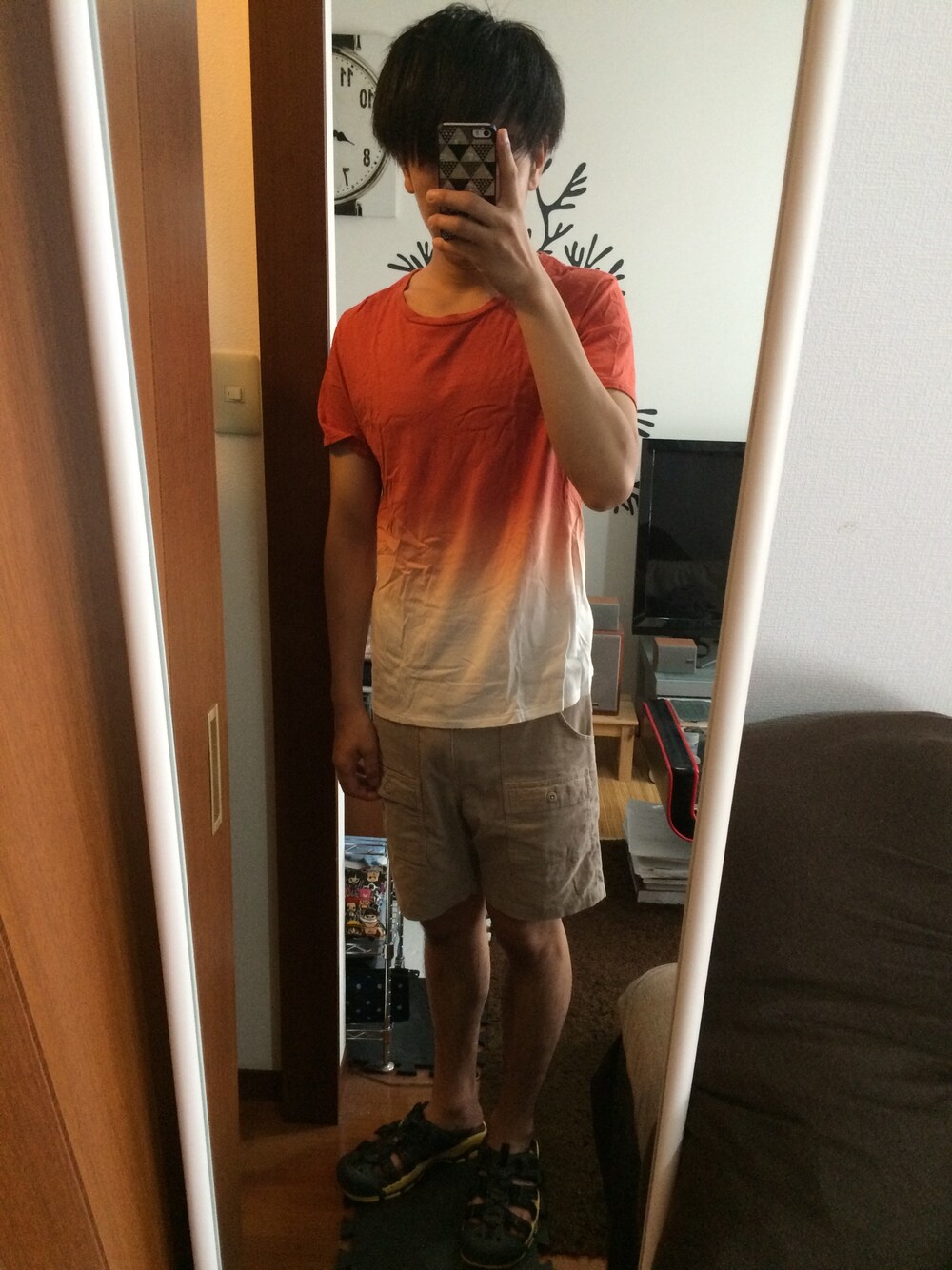 暑いですね! 今日は赤と白のグラデーションできめました! ベージュの短パンに合わせるのが気に入ってます♪