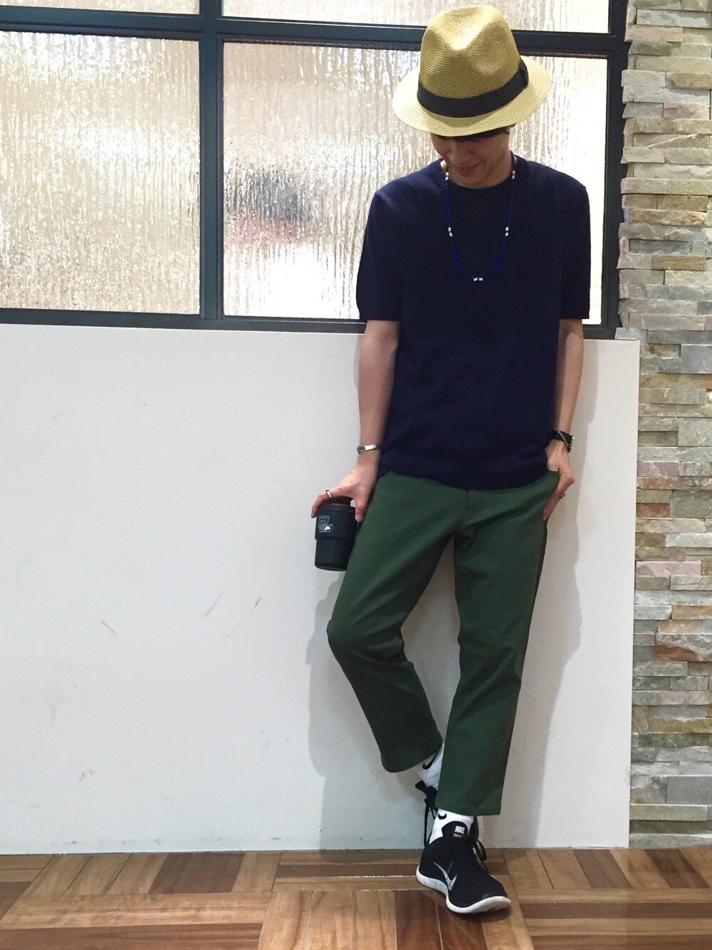 ご覧頂きありがとうございます。 今回はカーキ✖︎ネイビーです。 シンプルなカラーリングなので、小物をアクセントにしております。
