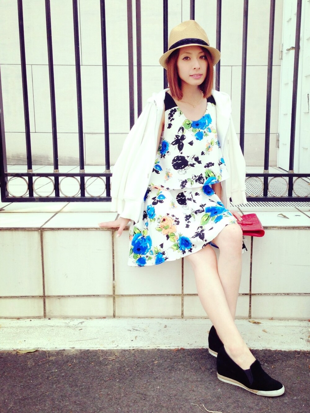 カラフルな花柄ワンピース♡ ハットやワンピースの肩ひも、 シューズの黒をポイントにしてみました(*^^*)!!!!! 夏が待ち遠しい〜