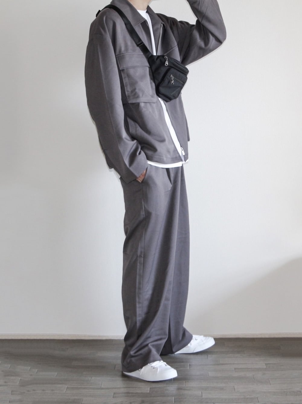 ゆーきのセットアップ「【セットアップ】TRストレッチ スーツ地 オーバーサイズ CPOジャケット & ワイドパンツ」を使ったコーディネート