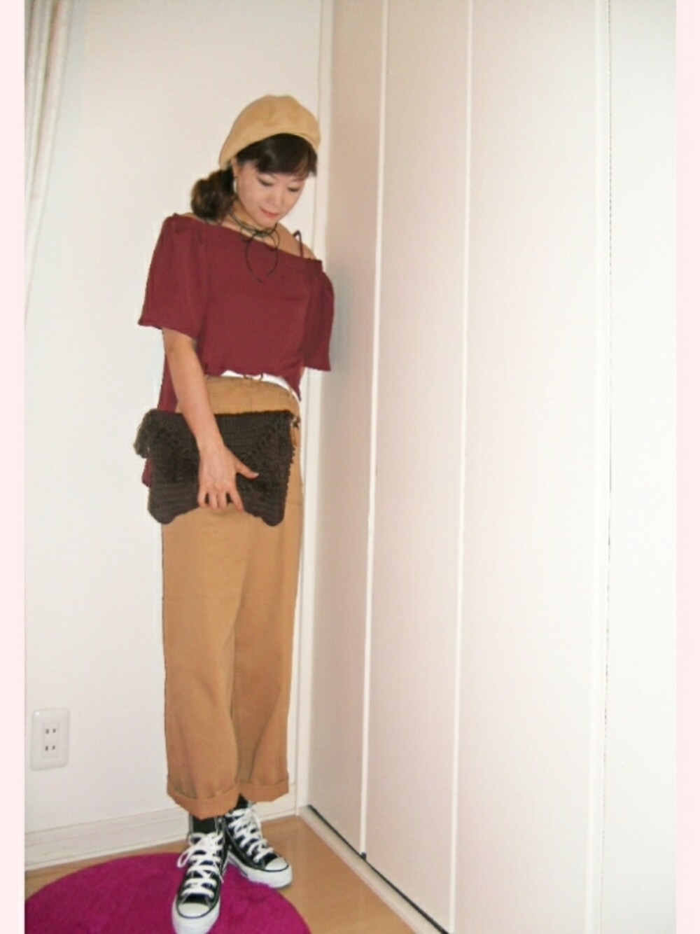 ご覧いただき、ありがとうございます♪ それから、いいねポチ下さり、ありがとうございます♪ まだまだ暑いので、色だけ秋コーデ。 秋色?茶系?コーデですね。 トップスがオフショルで、可愛い系なので、 パンツの裾を折り上げて、 黒コンバースのハイカットを わざと見せるように、しました。 よく見たら、オフショルのひも、 浮いてます~スミマセン(汗)!!
