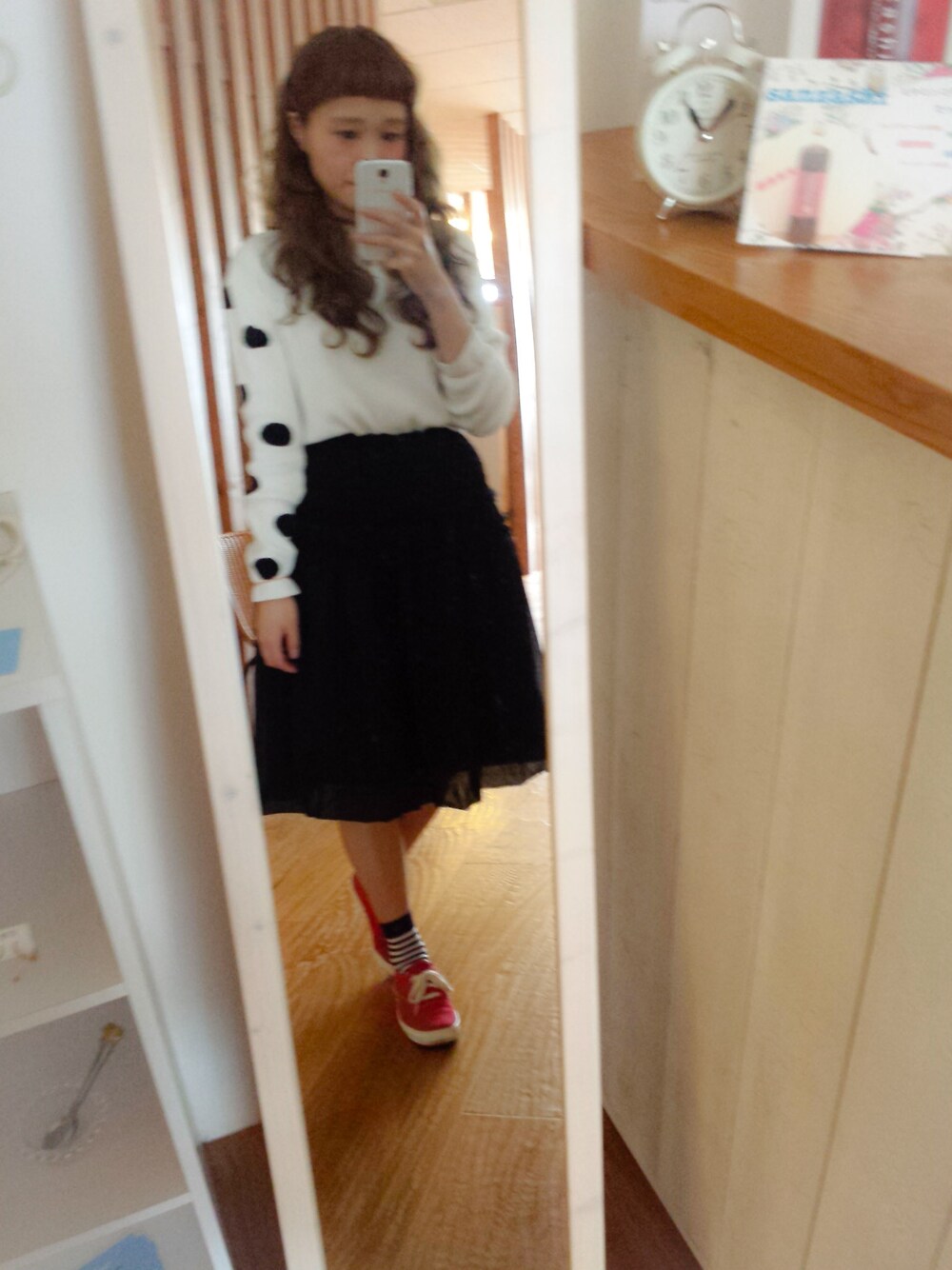 黒×白コーデに 赤スニーカー♪ ちょびっと ドット