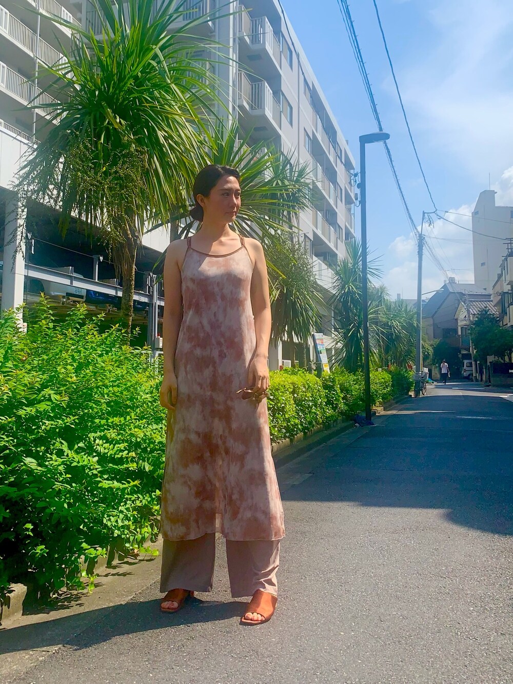 メッシュ素材のタイダイ柄キャミワンピースで夏コーデ 長い丈でも風を通すから涼しくて夏はヘビロテしてしまいます😊
