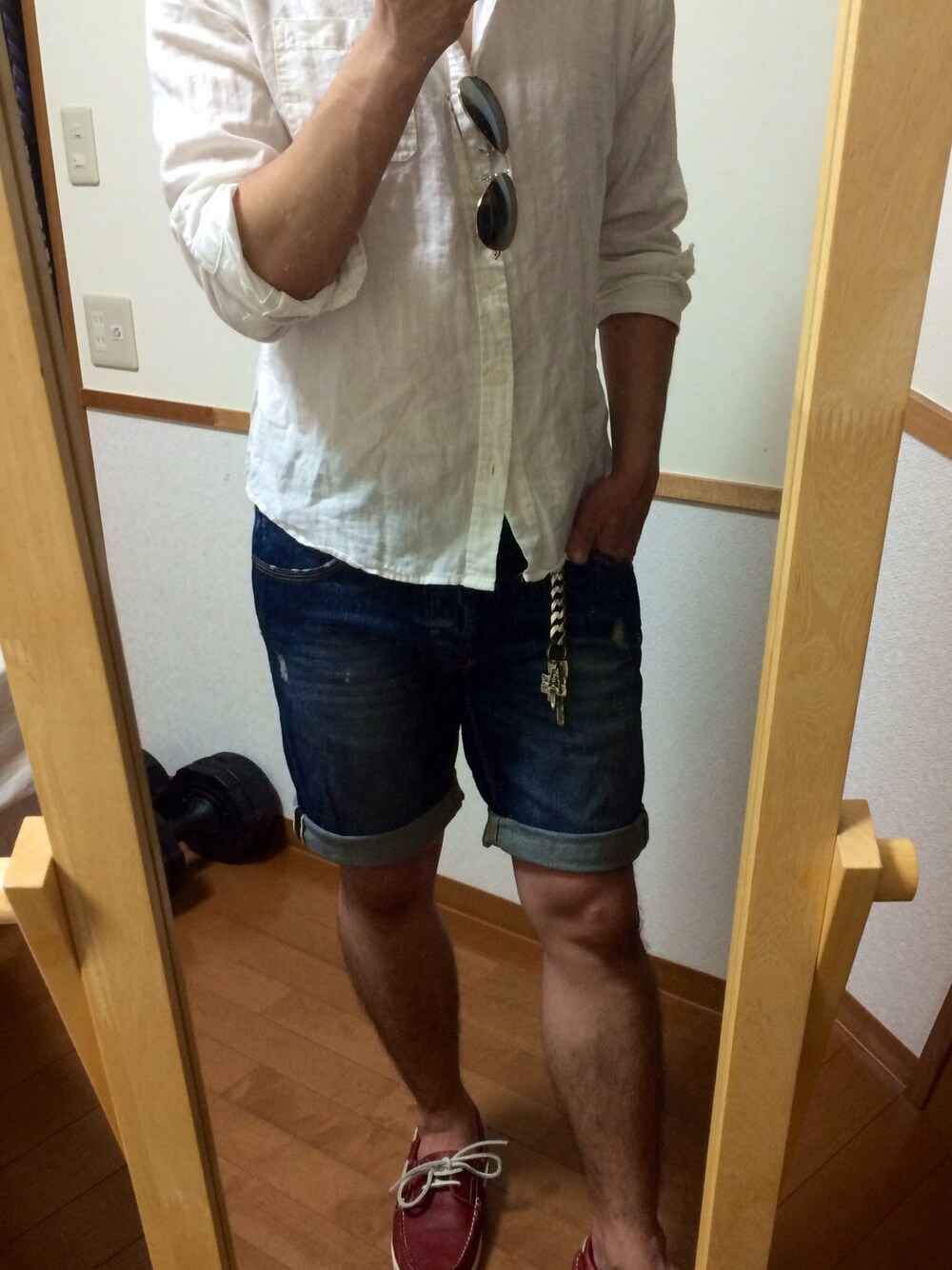 シャツ→ブランド不明 パンツ→ZARA シューズ→ABCマート 白シャツにデニムショーツで海外セレブをイメージしてみました