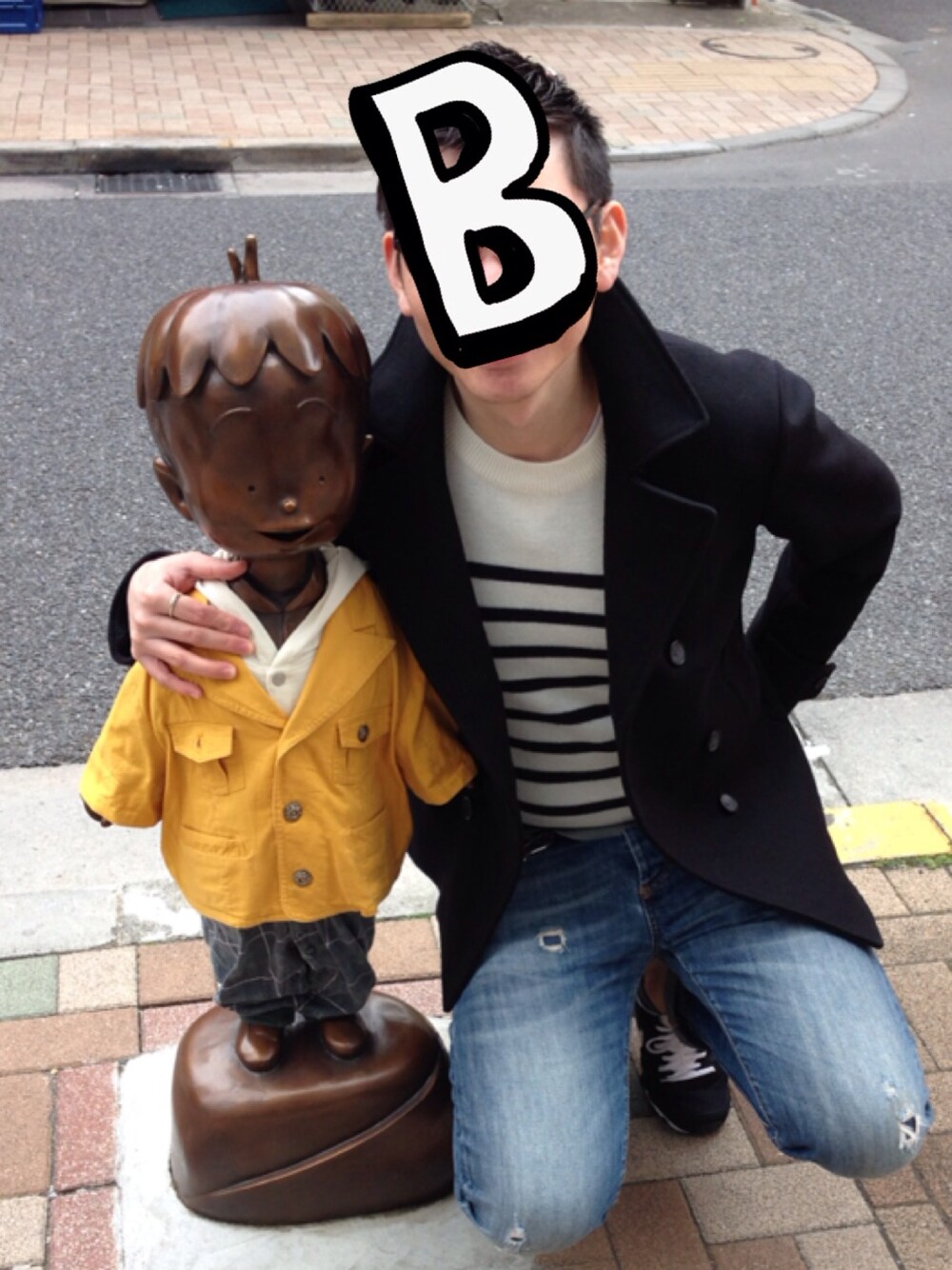 神楽坂にて、コボちゃんと。 ピーコート、ボーダーニットは鉄板ですね。