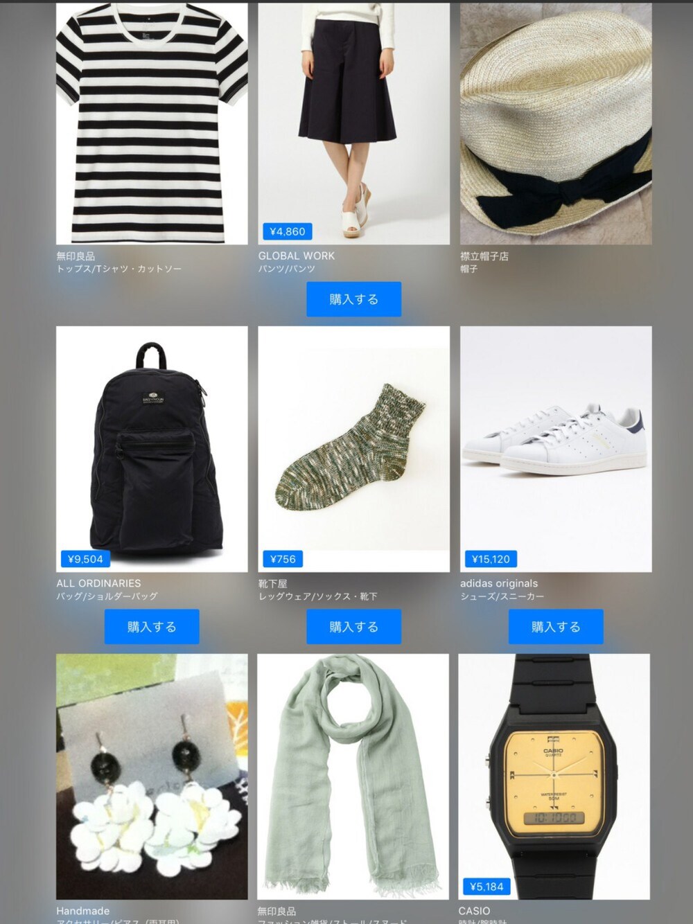 無印良品GLOBAL WORK¥4,950襟立帽子店BAG'n'NOUN¥9,680靴下屋¥770adidas Originals¥15,400Handmade無印良品CASIO¥5,280この画像から似たアイテムを検索できます2287