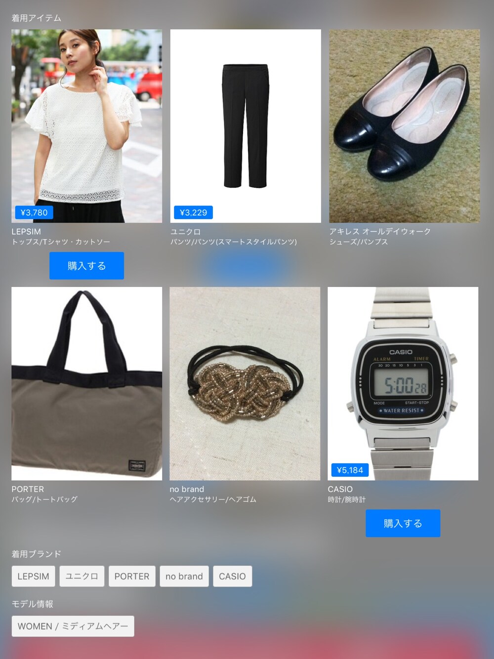 LEPSIM¥3,850UNIQLO¥3,289アキレス オールデイウォークPORTERno brandCASIO¥5,280この画像から似たアイテムを検索できます1267お気に入り (1)70yu.maさんへのコメントNO COMMENTコメントはスマートフォン用アプリからご利用できます着用アイテム¥3,850LEPSIMLEPSIMTシャツ/カットソー (ホワイト系)Tシャツ/カットソーサイズ:MEDIUM着用コーデ:11件商品を見るZOZOTOWNで購入する¥3,289UNIQLOUNIQLOパンツ (ブラック系)パンツサイズ:M着用コーデ:57件探すZOZOTOWNで探すアキレス オールデイウォークアキレス オールデイウォークパンプス (ブラック系)パンプス探すZOZOTOWNで探すPORTERPORTERポーター ラウンド トートバッグトートバッグ (ベージュ系)トートバッグ探すZOZOTOWNで探すno brandno brandヘアゴム (ブラウン系)ヘアゴム探すZOZOTOWNで探す¥5,280CASIOCASIOデジタル腕時計 (シルバー系)デジタル腕時計サイズ:FREE着用コーデ:208件探すZOZOTOWNで探すyu.maのTシャツ/カットソー「レースカサネソデフレアプルオーバーSS 723971」を使ったコーディネート2016.7.292016.7.30着用ブランドLEPSIMUNIQLOPORTERno brandCASIOタグ#シンプルコーデ#レーストップス#アンクルパンツモデル情報女性・156cmミディアムヘアー似ているアイテムLEPSIM × Tシャツ/カットソーUNIQLO × パンツPORTER × トートバッグno brand × ヘアゴムCASIO × デジタル腕時計yu.ma@yuumaa / 156cm / WOMEN / ミディアムヘアー0コーディネート0フォロワー注目のコーディネートアプリでもっと見るもっと見る