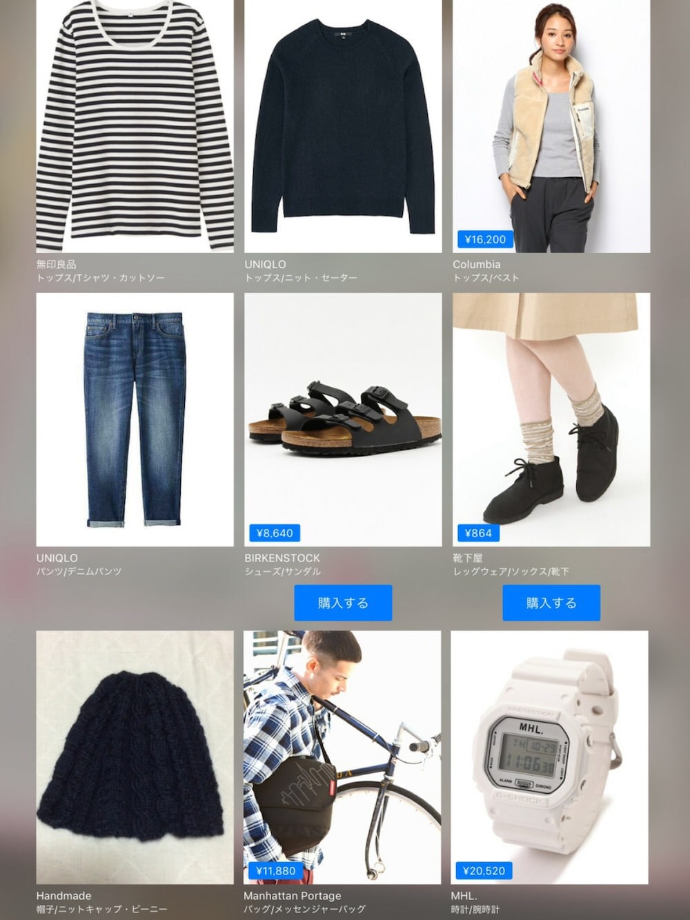 無印良品UNIQLOColumbia¥16,500UNIQLOBIRKENSTOCK¥8,800靴下屋¥880HandmadeManhattan Portage¥14,080MHL.¥20,900この画像から似たアイテムを検索できます75819