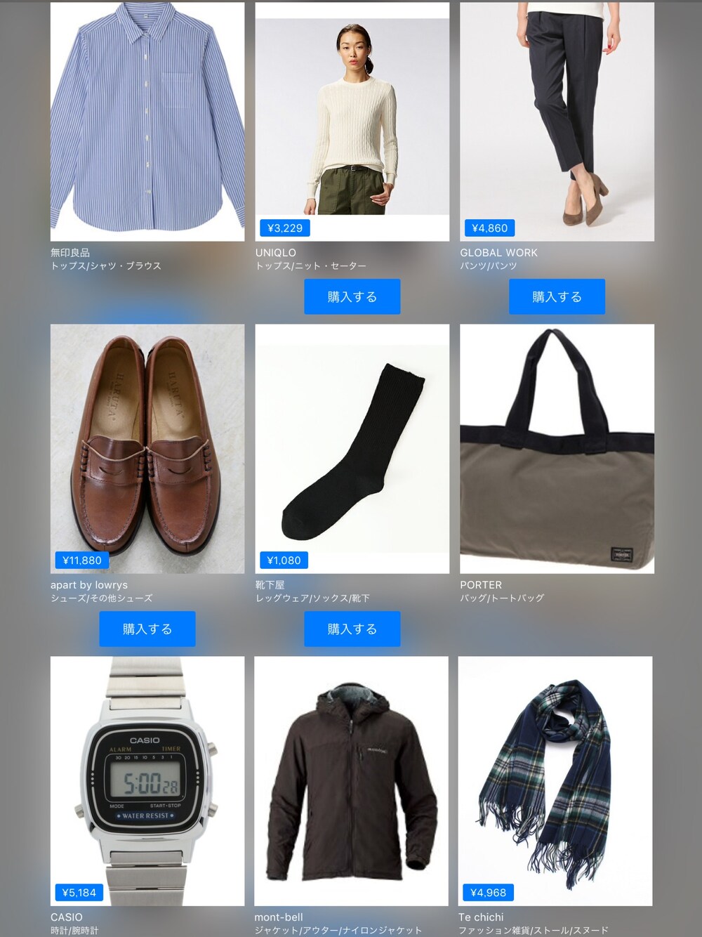 無印良品UNIQLO¥3,289GLOBAL WORK¥4,950A part by¥12,100靴下屋¥1,100PORTERCASIO¥5,280mont-bellTe chichi¥5,060この画像から似たアイテムを検索できます70328お気に入り (0)280yu.maさんへのコメントNO COMMENTコメントはスマートフォン用アプリからご利用できます着用アイテム無印良品無印良品シャツ/ブラウス (ブルー系)シャツ/ブラウス探すZOZOTOWNで探す¥3,289UNIQLOUNIQLOニット/セーター (ホワイト系)ニット/セーターサイズ:M着用コーデ:824件探すZOZOTOWNで探す¥4,950GLOBAL WORKGLOBAL WORKその他パンツ (ブルー系)その他パンツサイズ:MEDIUM着用コーデ:46件商品を見るZOZOTOWNで購入する¥12,100A part byA part byローファー (ブラウン系)ローファーサイズ:MEDIUM着用コーデ:51件探すZOZOTOWNで探す¥1,100靴下屋靴下屋ソックス/靴下 (ブラック系)ソックス/靴下サイズ:22.0~24.0cm着用コーデ:73件探すZOZOTOWNで探すPORTERPORTERポーター ラウンド トートバッグトートバッグ (ベージュ系)トートバッグ探すZOZOTOWNで探す¥5,280CASIOCASIOデジタル腕時計 (シルバー系)デジタル腕時計サイズ:FREE着用コーデ:208件探すZOZOTOWNで探すmont-bellmont-bellライトシェルパーカナイロンジャケット (ブラウン系)ナイロンジャケット探すZOZOTOWNで探す¥5,060Te chichiTe chichiストール/ショール (ブルー系)ストール/ショールサイズ:フリ-着用コーデ:15件探すZOZOTOWNで探すyu.maのシャツ/ブラウスを使ったコーディネート2016.11.10 寒かったです_(:3 」∠)_2016.11.10着用ブランド無印良品UNIQLOGLOBAL WORKA part by靴下屋PORTERCASIOmont-bellTe chichiタグ#シンプルコーデ#ストライプシャツ#ケーブルニット#テーパードパンツ#ローファー#チェックストール#チープカシオモデル情報女性・156cmミディアムヘアー似ているアイテム無印良品 × シャツ/ブラウスUNIQLO × ニット/セーターGLOBAL WORK × その他パンツA part by × ローファー靴下屋 × ソックス/靴下PORTER × トートバッグCASIO × デジタル腕時計mont-bell × ナイロンジャケットTe chichi × ストール/ショールyu.ma@yuumaa / 156cm / WOMEN / ミディアムヘアー0コーディネート0フォロワー注目のコーディネートアプリでもっと見るもっと見る