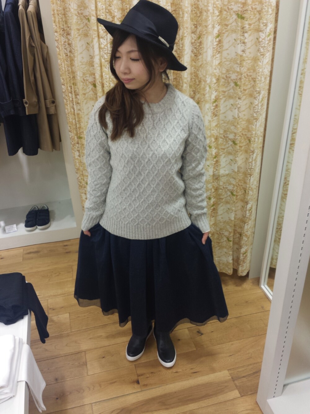 1枚で着てもかわいいニット、中にシャツや付け襟をあわせたり色んなコーデにつかえます♪ スカートはリバーシブルです!