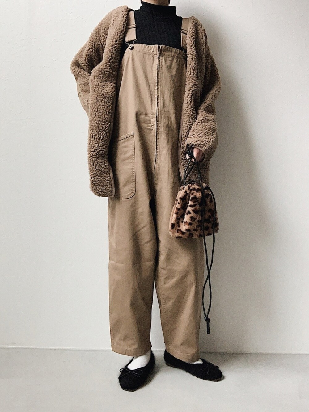 いっこ前のアウターあり バージョンです🟤 レオパード柄のファーバッグは 掛けたり持ったりできて便利。 来月再入荷予定です𓎤 𓍲outer𓇠first down 𓍲tops𓇠uniqlo 𓍲overalls𓇠niko and… 𓍲bag𓇠INN 𓍲shoes𓇠INN