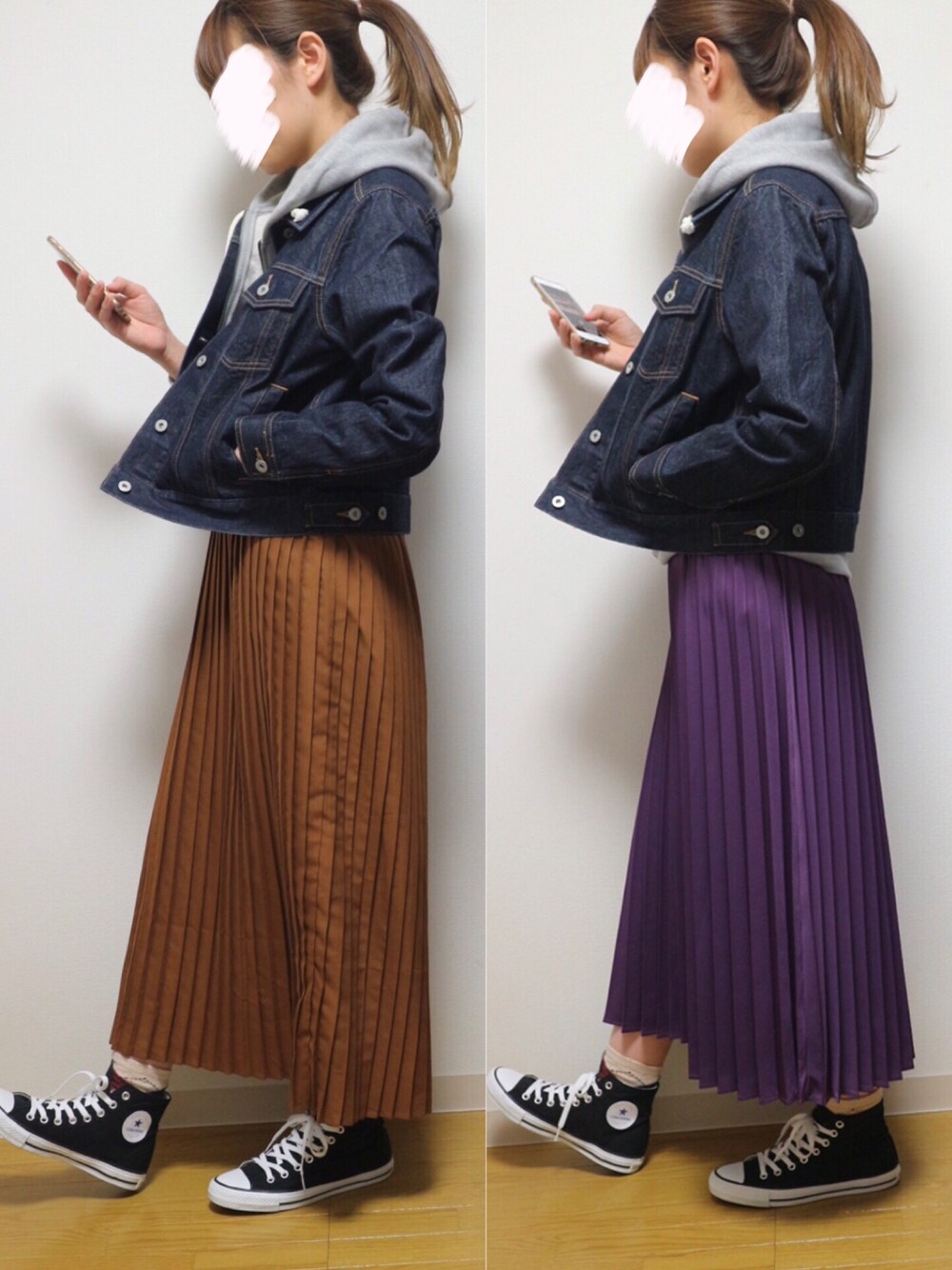 GUのデニムジャケットを使って色違いコーデ! パープルとブラウンのプリーツスカートはどちらもセールで半額で買いました💕 春まで使えるコーデです✨