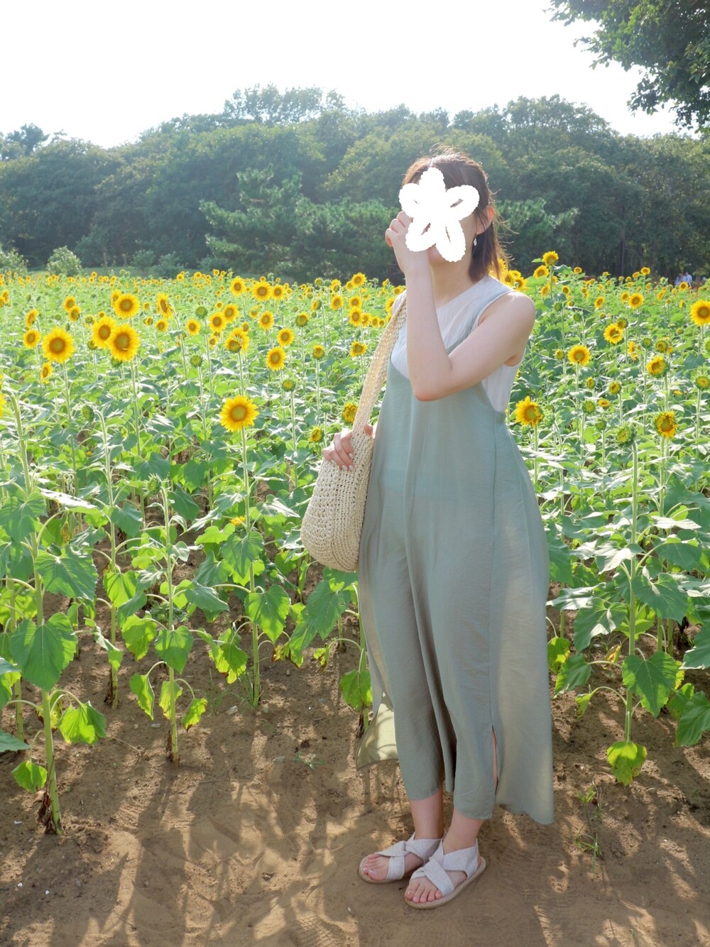 咲きはじめのひまわり畑🌻 ローリーズファームのキャミワンピ、長さ調整出来るから身長気にせずに着れてお気に入り。