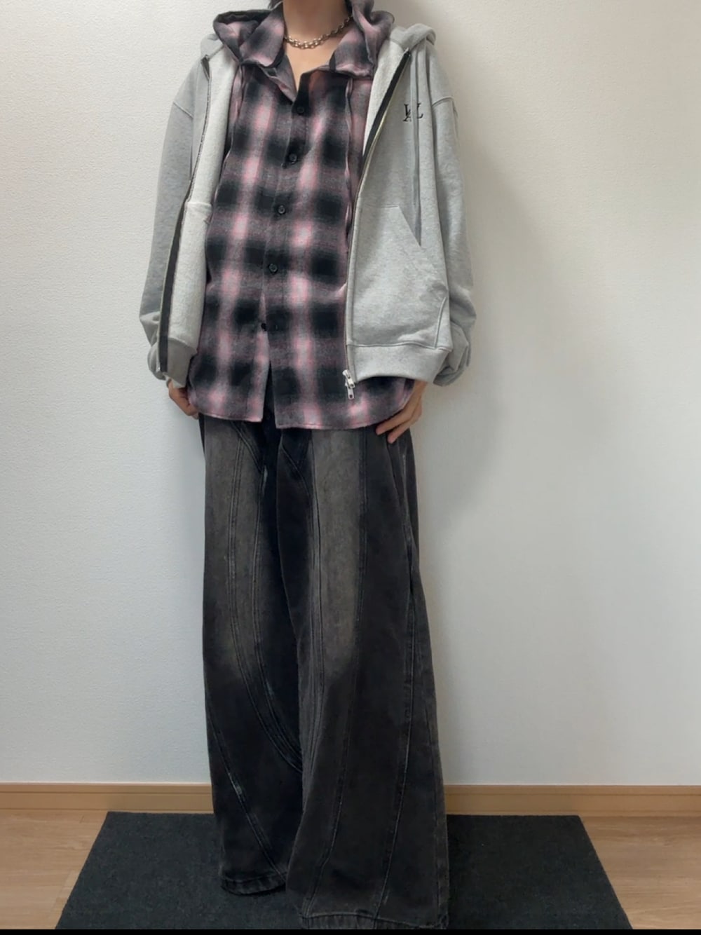 チェックシャツとパーカーにデニムを履いたコーデ