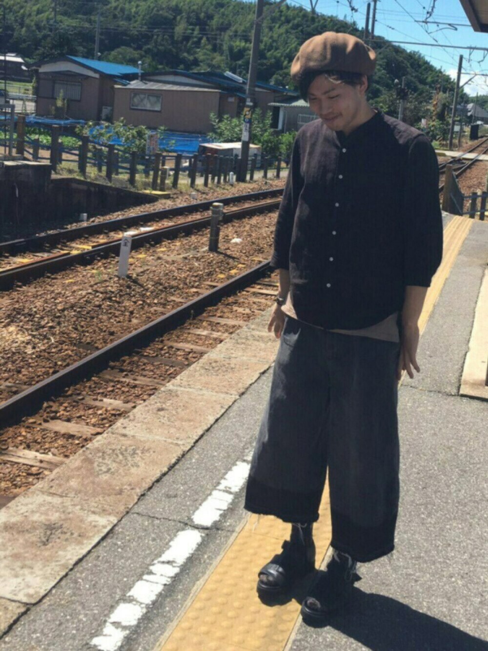 先日、趣味のカフェ巡りをしてきました。 カフェに向かう道中、無人駅で天気も良かったので、パシャり(^^) 黄色い線の内側までお入りくださいって感じですね(笑) 巡ってきたのは愛知県西尾市にある「たらそ」というカフェで、三河湾に臨む景色がすごく綺麗な所です。 愛知県ではめっちゃくちゃ人気のお店で(すんごい田舎にあるのに)、平日に行って2時間近く待ちましたが、その甲斐あって、最高のロケーションと美味しい料理、ゆったりとした時間を愉しむことができました!!!!\(^o^)/ 愛知県の方々はぜひぜひ、一度は足を運んでみてはいかがでしょう。男性の方、女性とのデートには最高だと思いますよっ(笑) あら コーデの説明とか全然してなかったですね(笑) 「たらそ」については、自身のブログやtwitter、Facebook、Instagramなどで写真付きでご紹介させていただいております。本当にめっちゃくちゃきれいでいいところです。ぜひ写真でご覧になってください(^^) あ ちなみに、Instagramで「たらそ」って打つと、すっごい行きたくなるような、良い写真いっぱい見れますよ~(*´ω`) さてさて! 先日は、涼しかったので。 全体的に夏ではなく、秋物コーデになります。 『ワイドパンツ+ベレー帽』 『靴下×サンダル』 『シャツ×ロングタンクトップ 』 のようにオシャレ要素を強めて作っています。 「都会にいるとこんな奴が居そう」 とか 「こんなショップ店員さん居るわ」 とか そんな勝手なイメージで作りました(笑) オシャレ感度高めです(←自分で言う) (……行ったの結構田舎なんですけどね……。) なんでこんなオシャレしてったんだろ。笑 はい(笑) コーデについて! 全体をブラックでまとめて、そこに挿し込むようにブラウンを足しました。 もう連続三回目の登場なので、今まで見ていただいた皆様はお気付きでしょう。僕はベレー帽をかなり気に入っています!!(笑) 今回は茶色です……(//-//) 一瞬でシャレた感じが出せるのがすごく良いのです。 写真では分かりにくいですが、靴下も茶色のものを履いて秋っぽさをだしています。 ブラック×ブラウン というより ブラック+ブラウン という感じですね。 HAREのガウチョパンツはめちゃめちゃかっこいいんですけど、すんごい着こなしに迷ったので、全体をきれいめにして、ラフな要素を入れるイメージで着用してみました。 前回もお伝えしたFINEB○YS掲載の7:3の情報が生きております(笑) ついでに言うと僕のコーデはワイドパンツ多めですが、実はスキニーよりも好きです。 スキニーを好きに〜なりたい。