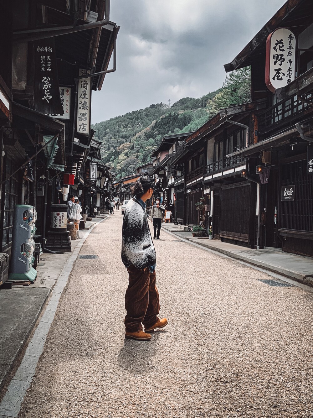 奈良井宿にて撮りました schottの霜降りカーディガン とてもお気に入りです モヘアのようにふわふわな所がポイント✨ 古着屋にて購入したブラウンのコーデュロイ パンツに色を合わせティンバーを履きました