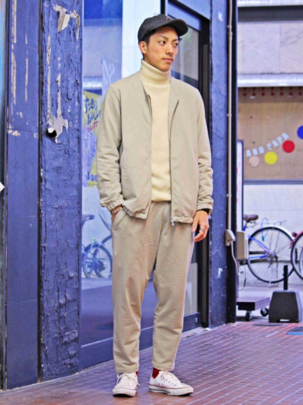 ベージュトーンで合わせて、色が淡くなりすぎないようにキャップはグレー。 ソックスは赤で挿し色にしてます。 普通のセットアップなのですが、生地がジャージのような素材で伸縮性バツグンです。 着ていてとても気持ちがいいですよ(^^)