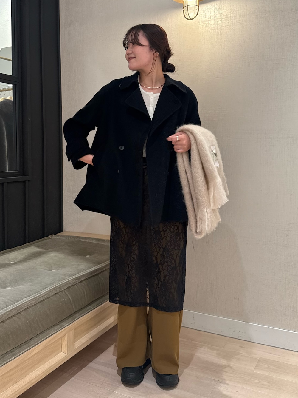 軽くてあったかいピーコートは、どんなコーデにも馴染む万能アウター。 1枚あると着回しの幅がぐっと広がります! パンツはとろみ素材でレイヤードしてもごわつかず、きれいめにもカジュアルにも使える優秀アイテム◎ 168cmで【38】サイズを着用しています。 レイヤードしているレーススカートはペチコート付きで、そのままスカートとしても着用可能◎ シンプルなコーデにプラスするだけで一気に華やかさが出る、大人かわいいポイントアイテムです♪