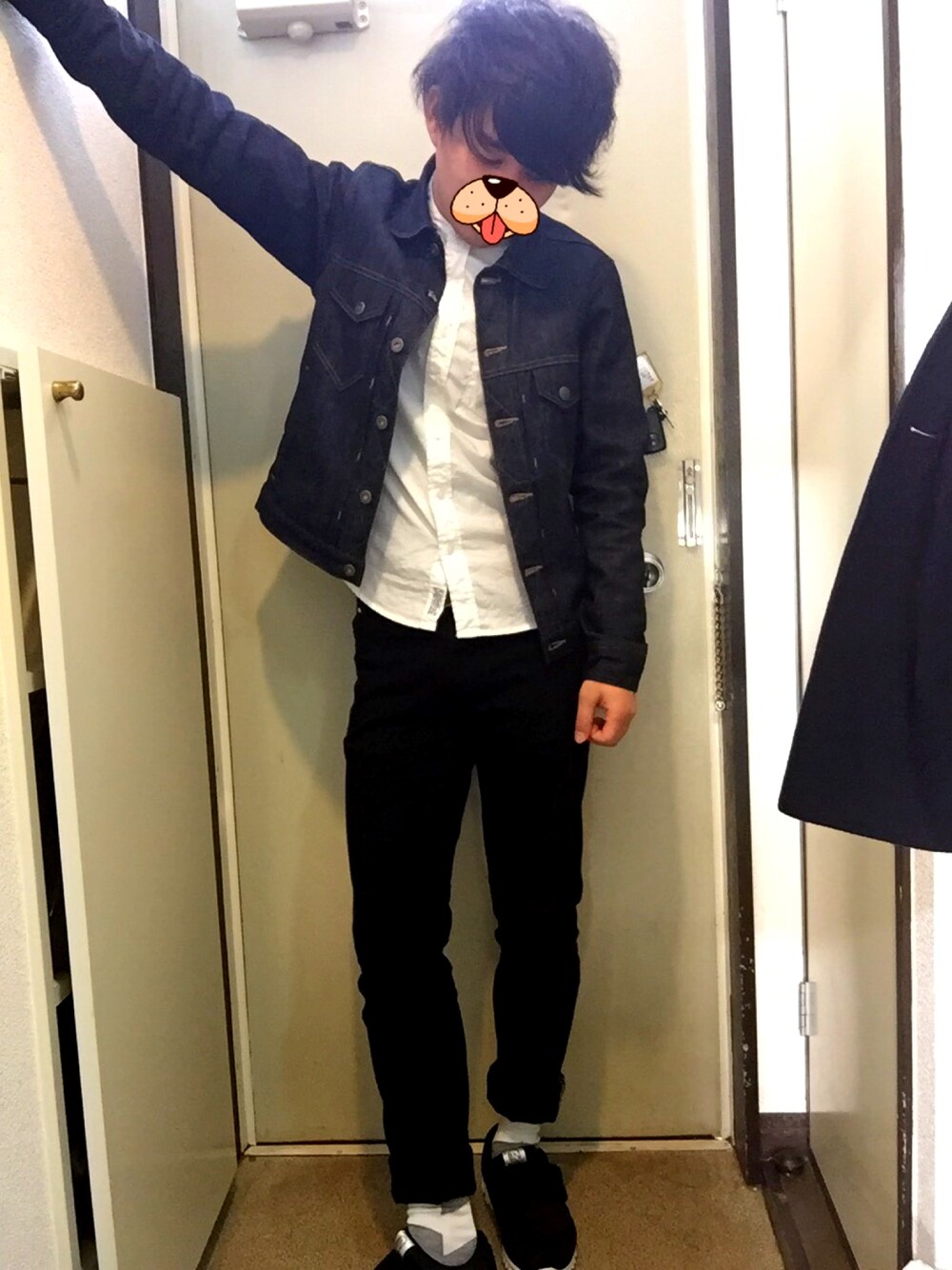 外が雪だから黒い目の服装にして目立とうとしました笑 上から デニムジャケット 襟ないシャツ 黒スキニー 印の靴 ってなってまーす スキニーの裾おりすぎかな?笑 外出るときはもうちょい下にして行きます〜笑