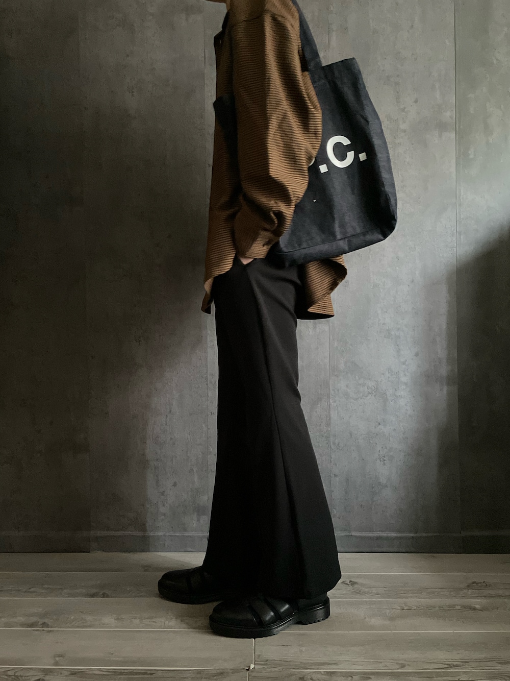 ﹣coordinate﹣ shirt × fuller pants × denim ﹣color choice & accent﹣ check brown × black × indigo blue フレアパンツシルエットの スタイルよく魅せる◎ ゆるっと coordinate Instagram → @yukun_wear_ フォローよろしくね🐰 🍀