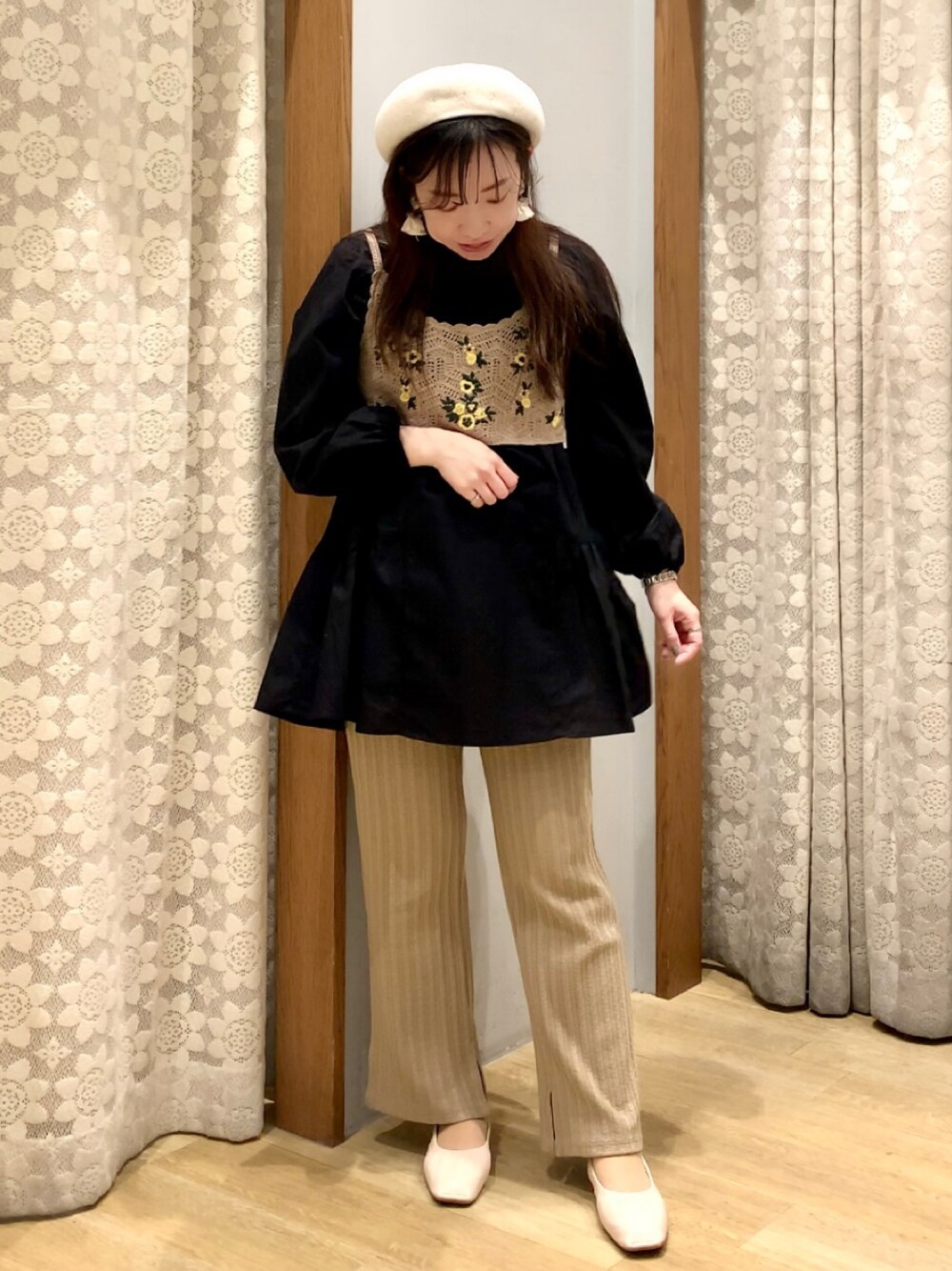 【骨格ウェーブ/イエベ春】 〇ビスチェ 普段Sサイズ 着用Fサイズ フラワー刺繍のニットビスチェです! コーデのポイントに入れやすい落ち着いた色味です! 〇チュニック 普段Sサイズ 着用Fサイズ バックティアードのシャツチュニックです! ふんわりAラインシルエットになります! 〇パンツ 普段Sサイズ 着用Fサイズ ランダムリブのニットパンツです! 足首内側にスリットが入っています!