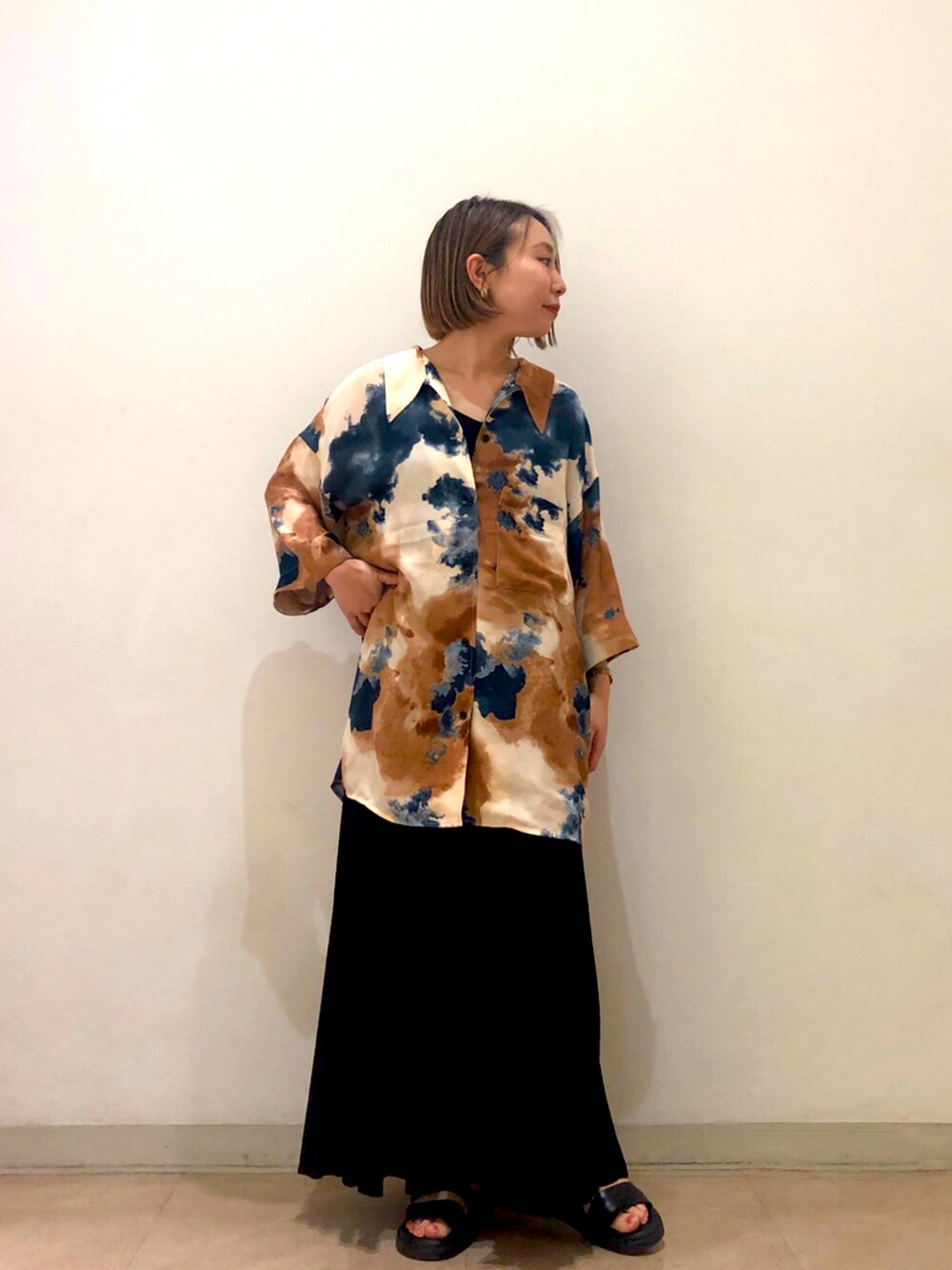 柄がおしゃれ〜なシャツ! プリーツキャミワンピと重ねて 大人カジュアルコーデに◎ シャツは羽織りにしてもよき👌🏻