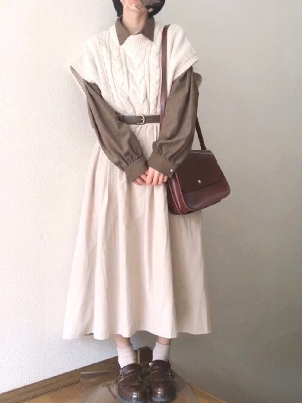 古着風コーデ 閲覧ありがとうございます*⋆✈︎ ベージュとブラウンでまとめて、、 古着風コーデを組んでみました シャツの襟.袖、ベルト、靴、鞄をブラウンでまとめているのがポイントです。 小物の色は同色、同系色で揃えると、 コーデ全体にまとまりが出ます◎ 2色コーデは、シンプルになりがちなので 小物でアクセントを入れたり レイヤードなどでお洒落度アップさせると良いです。と、思っております。(笑)