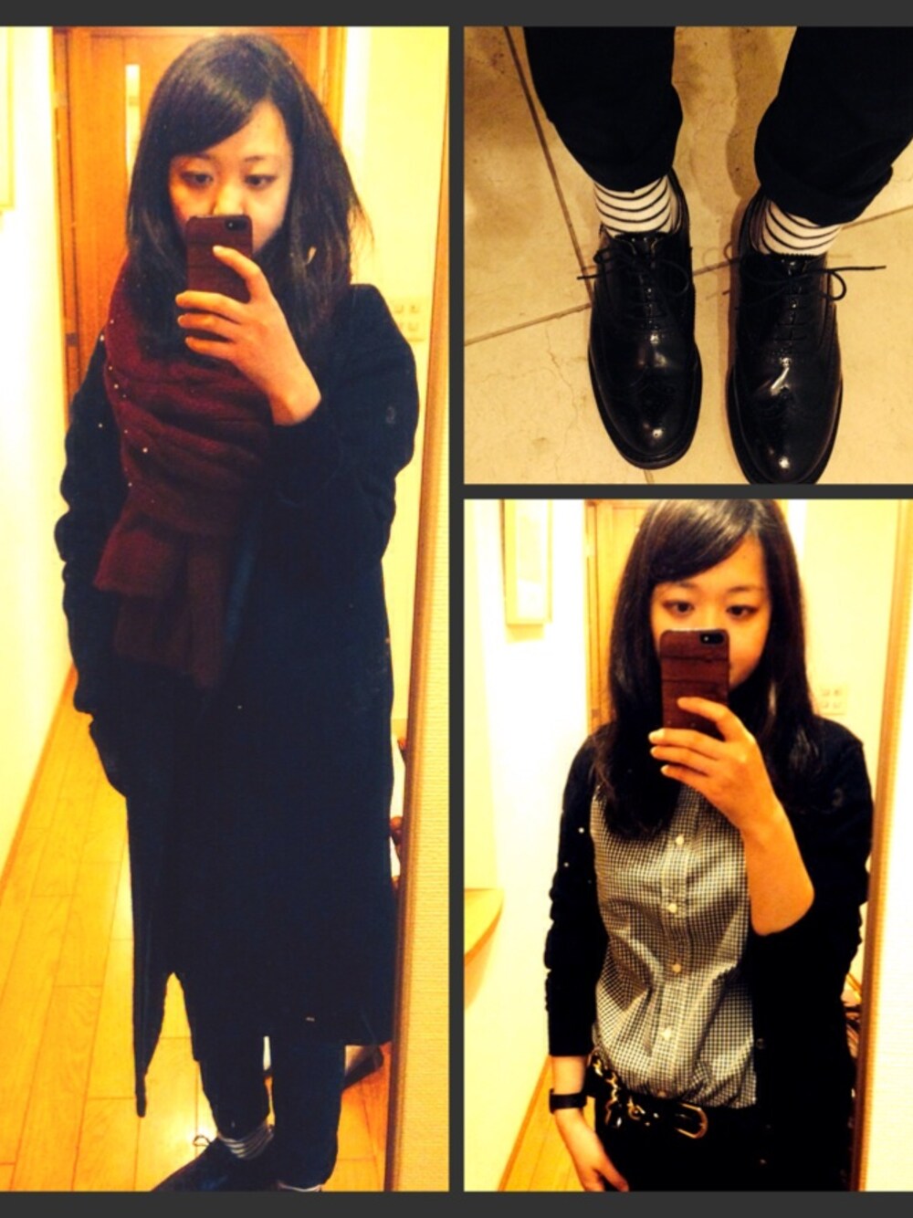 マフラー/OKIRAKU シャツ/LOWRYS FARM カーディガン/american apparel パンツ/milk fed ベルト/RNA 今日は黒く細い気分でした。 会社は靴下禁止なので律儀に履き替える笑