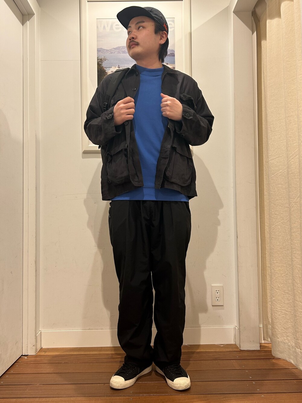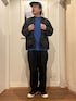 本日のスタイリング! ブルーのスウェットが差し色のコーディネート! アウターもタイダイ染めされていて これからの季節に重宝する春アウター