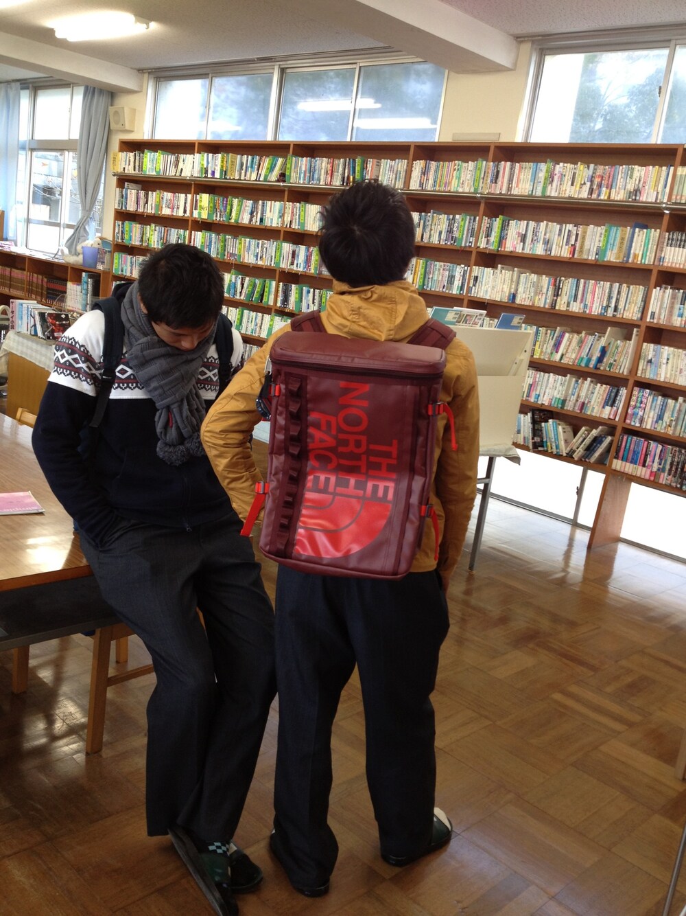 左の方が右の方を引き立てていて、リュックサックは灼熱の赤、テイパードのきいたパーカーでスキニーのズボンであわせてみました。