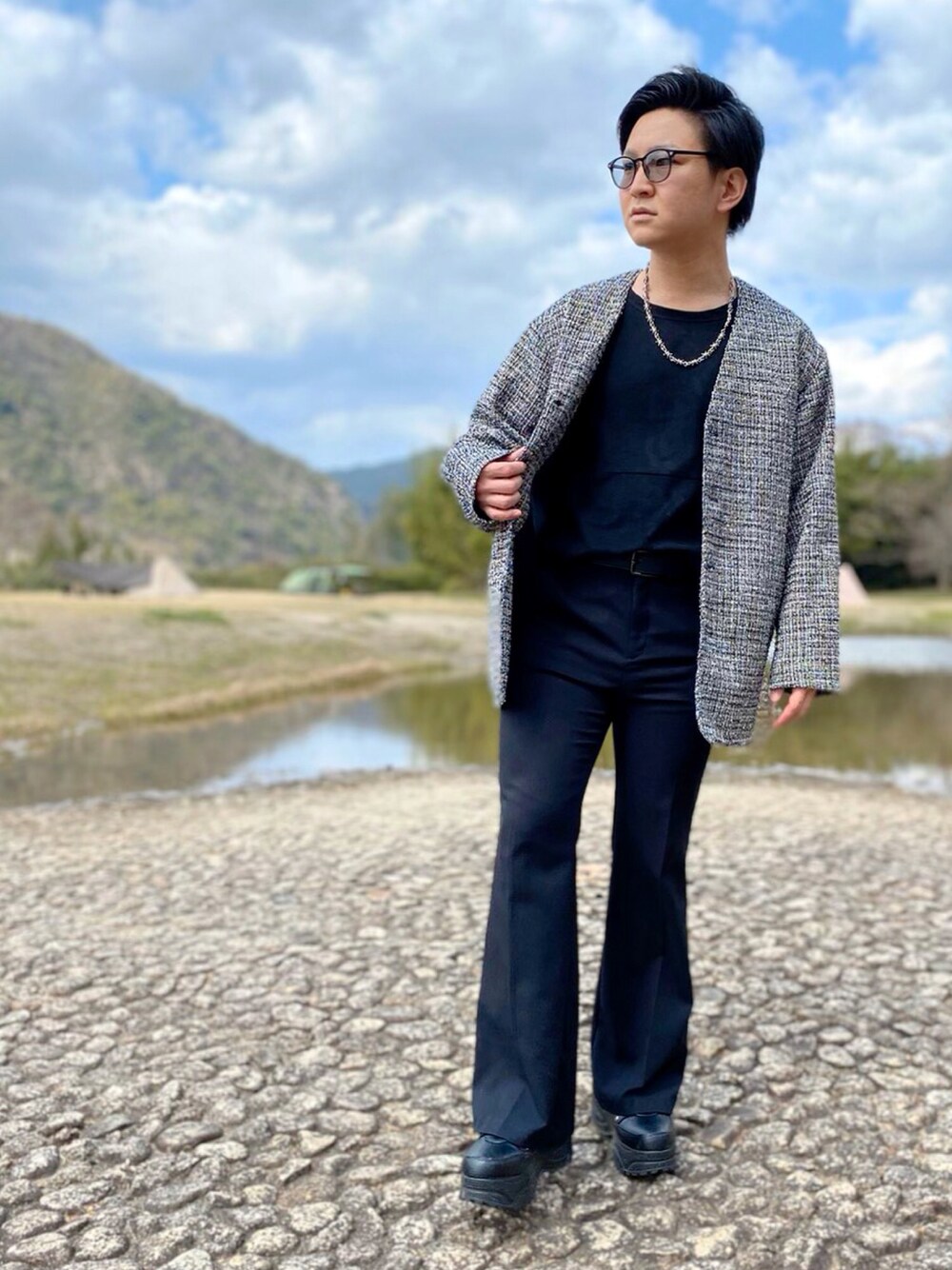 ▷▶︎キレイめモードコーデ◀︎◁ ▽カーディガン ▼黒Tシャツ ▽有刺鉄線チェーンネックレス ▼黒フレアパンツ ▽レザーベルト ▼厚底スニーカー ▽カラーサングラス 全身ブラックにモノトーン刺繍のカーディゾンを合わせたコーデ☝🏻😎 "キレイめ×モード"を意識して、カラーサングラスや厚底スニーカーを使いながらもフレアパンツに黒Tをタックインしてキレイめシルエットを演出🦹🏼♂️💫 キレイめアイテムをモードっぽく使うことによって個性的なスタイルになりましま✨💪🏻