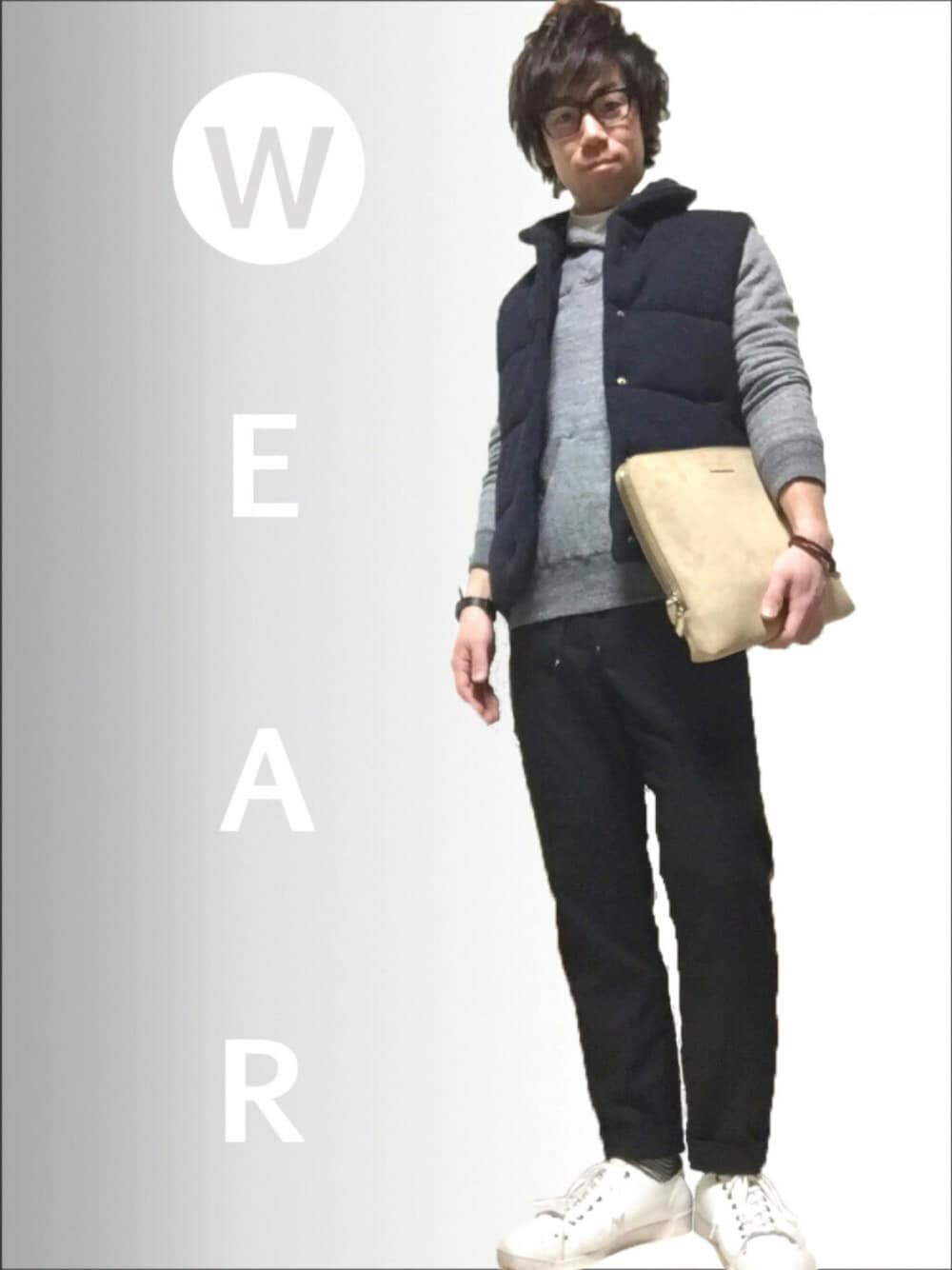 こんにちは、crothです‼︎ 今回はちょっとそこまでの感じのカジュアルコーディネートにしてみました。 この時期、移動距離が少ないとダウンベストが凄く重宝してます。しかし、カジュアル感が強いのでチェックや色物のパーカーで合わせたり、デニムで合わせたりすると子供っぽくなってしまいがちな気がします。 なので、色は抑えて黒、白、グレーを使い細身のアイテムでまとめました。革靴まで使うとキレイになりすぎる感じがしたので、白スニーカーでカジュアルに軽さを出しました。 腕まくりはパーカーのカジュアルさを少しでも減らして、時計やブレスレットで手首の簡素感をなくしました。 クラッチバックは買ったばかりなので使いたくて持ちました^^;