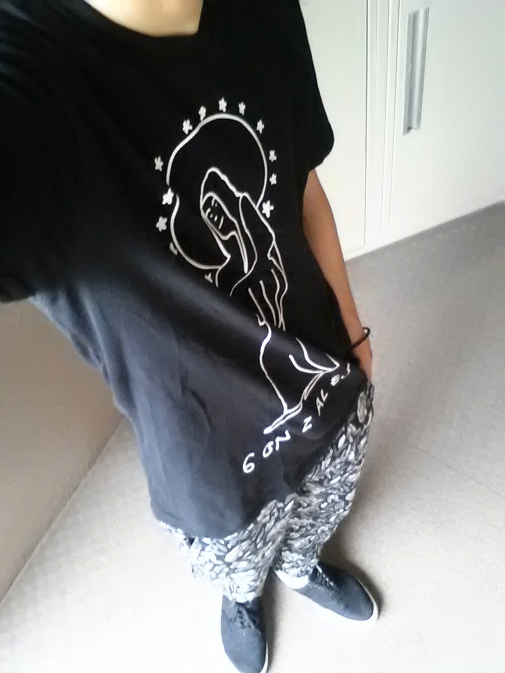ソックス : GU 今日のピックアップタグは「イラストT」なので マリア像をモチーフにしたTシャツを着てみました!