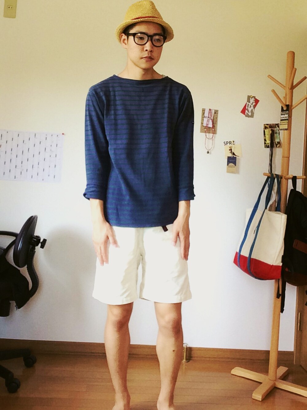 これからキャンプです‼︎ だいぶ着古したSAINT JAMES着ました‼︎ 紺地に緑のボーダーになってます( ´ ▽ ` )ノ 足はサンダル履きます♪