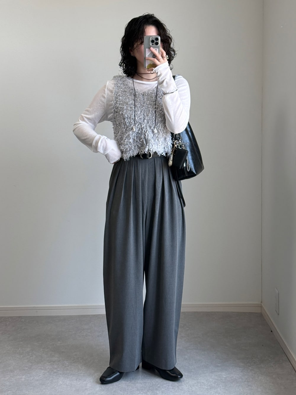 すっとやってみたかったシアートップスとベストを重ねるコーデ!フリンジがかわいい〜 コチラ▼tiptop 【丈が選べる】前後2wayフリンジベスト グレー系その他着用 ¥1,000オフクーポンでてます❣️